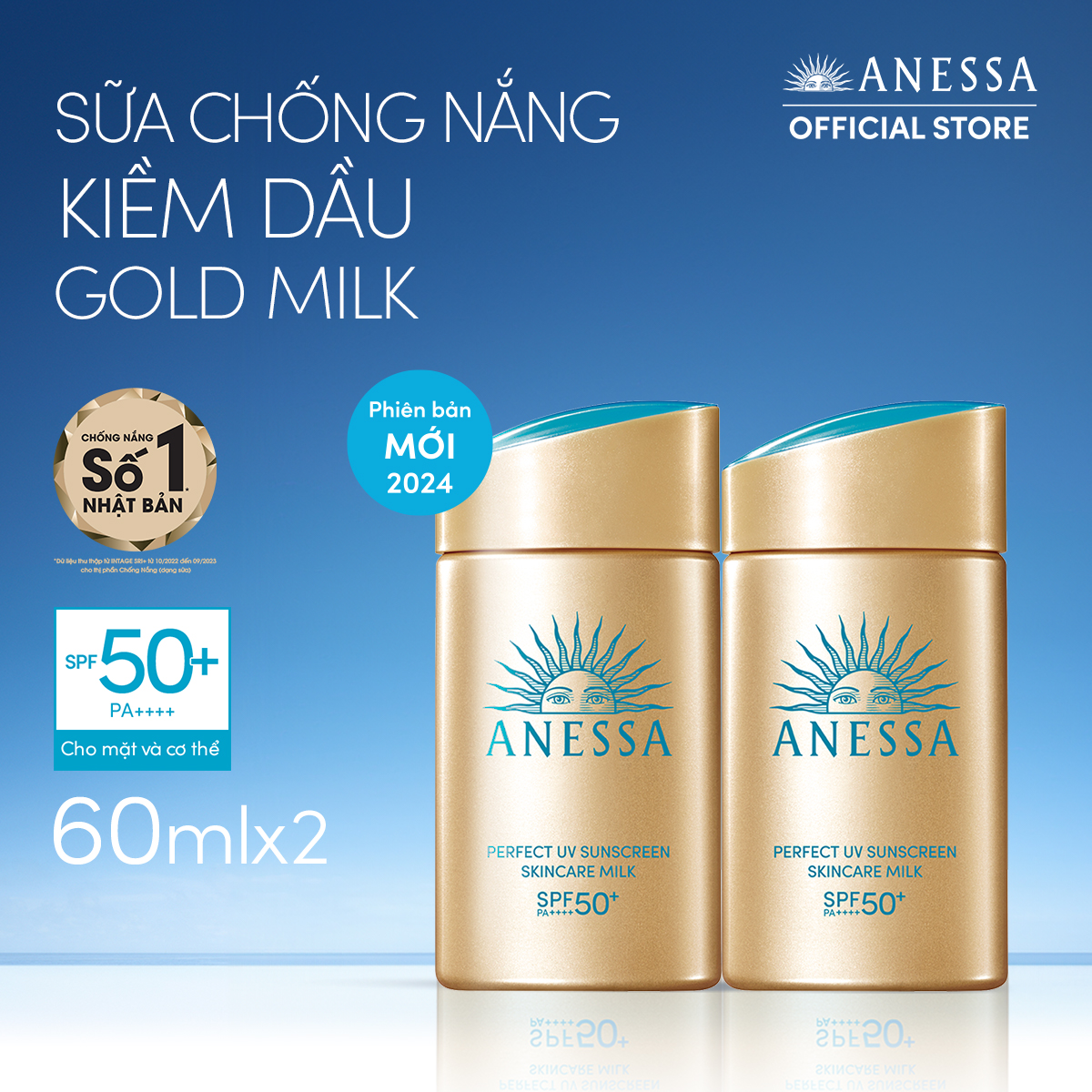 Bộ đôi 2 Kem chống nắng dạng sữa dưỡng da bảo vệ hoàn hảo Anessa Perfect UV Sunscreen Skincare Milk SPF 50+ PA++++ 60ml giúp bảo vệ da tối đa với kết cấu mỏng nhẹ, khô ráo và kiểm soát dầu hiệu quả. THÔNG TIN SẢN PHẨM Công dụng '- Sữa chống nắng kiềm dầu ANESSA Gold Milk SPF50+ PA++++ bán chạy số 1 Nhật Bản. Phiên bản mới với bao bì giấy thân thiện hơn với môi trường.