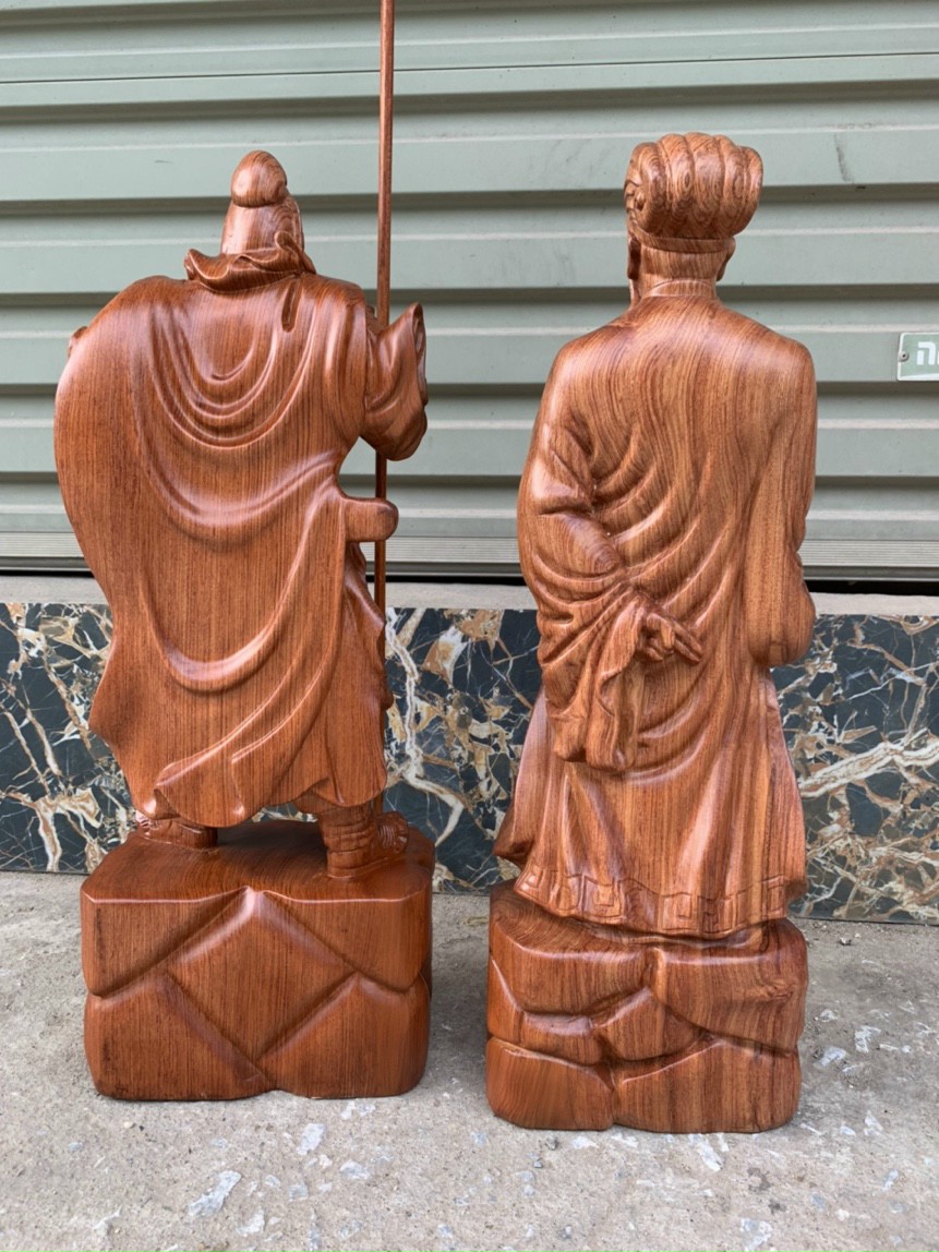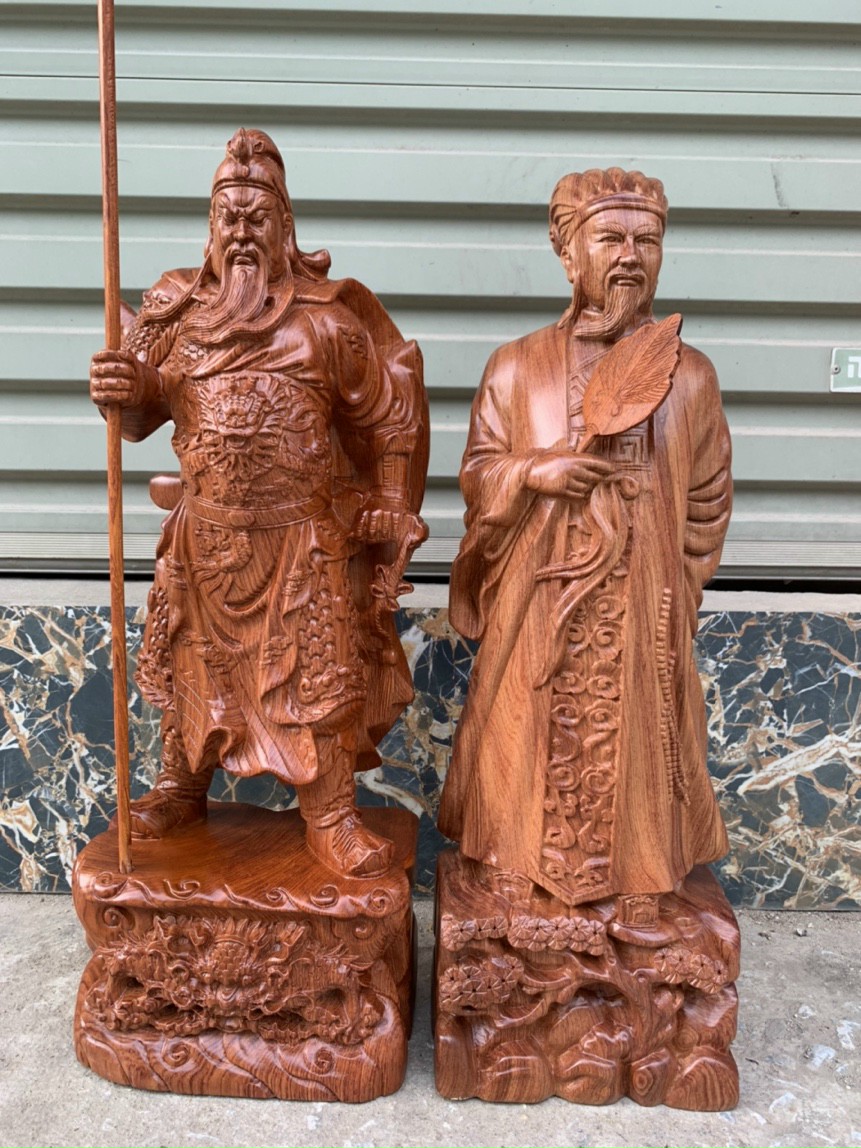 Tượng khổng minh gia cát lượng và tượng quan công .Được làm bằng chất liệu gỗ hương đá tự nhiên 100% Kích thước cao 70×22×14cm khổng minh Kích thươc quan công 70×28×19cm Bộ đôi văn võ song toàn khổng minh và quan công được trạm khắc tỉ mỉ tinh sảo kỳ công ,Đi hầu hết tất cả các đường nét chi tiết nội dung hoa văn của đôi tượng .Đều được chỉnh sửa ngọt tỉa ,Hoàn toàn bằng tay thủ công .Đồng thời tượng được kiểm định rất kỹ lưỡng như cho vào thẩm sấy cho gỗ khô kiệt .Mục đích để trống dập nứt vênh mo mối mọt .Kết hợp với trà nhám đánh giấy giáp nhiều lần cho sạch sẽ .Sờ mát lạnh .Song cho vào phun lót làm bóng mờ .Để giữ lại mầu sắc vân gỗ tự nhiên .Bộ cặp tượng được làm và hoàn thiện do bàn tay khối óc tài hoa ,Chính vì thế bộ cặp tượng văn võ song toàn đã đáp ứng đầy đủ những tiêu trí ( Đẹp bền rẻ ) Thẩm mỹ nghệ thuật với chất lượng tuyệt vời