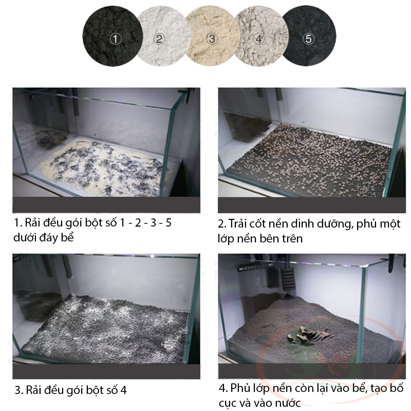 - Rải đều gói bột số 1 - 2 - 3 và 5 xuống đáy bể (cách thành bể 1 ~ 2 cm để thẩm mỹ).