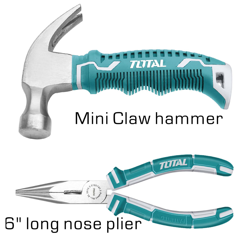 Bộ dụng cụ 6 món gồm búa, thước, dao, kềm, tua vít có hộp đựng TOTAL THKTHP90066 là một bộ công cụ đa năng được thiết kế để sử dụng trong nhiều công việc cắt, kẹp, đo đạt, tháo lắp và vặn vít