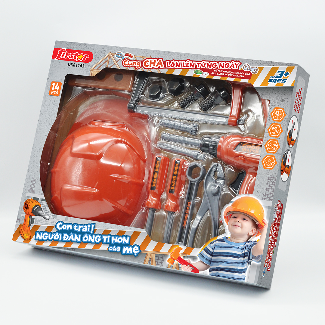 Mua tại TiktokBộ dụng cụ đồ chơi cho bé, DK 81163 Được mô phỏng với các dụng cụ cần thiết của các chú kỹ sư, công nhân, thợ cơ khíúp các bé trai tha hồ thỏa sức đóng vai và sáng tạo trong việc lắp ráp, sửa chữa các máy móc, đồ dùng vật dụng thường ngày. Thông qua trò chơi giúp bé định hướng nghề nghiệp và mang tới rất nhiều niềm vui cũng như kỹ năng hữu ích cho trẻ; Giúp trẻ bồi dưỡng nhận thức trực quan Phát triển sự phối hợp giữa tay và mắt Tăng cường ý thức trách nhiệm với cộng đồng Nhập vai và trải nghiệm cuộc sống Thông tin sản phẩm: