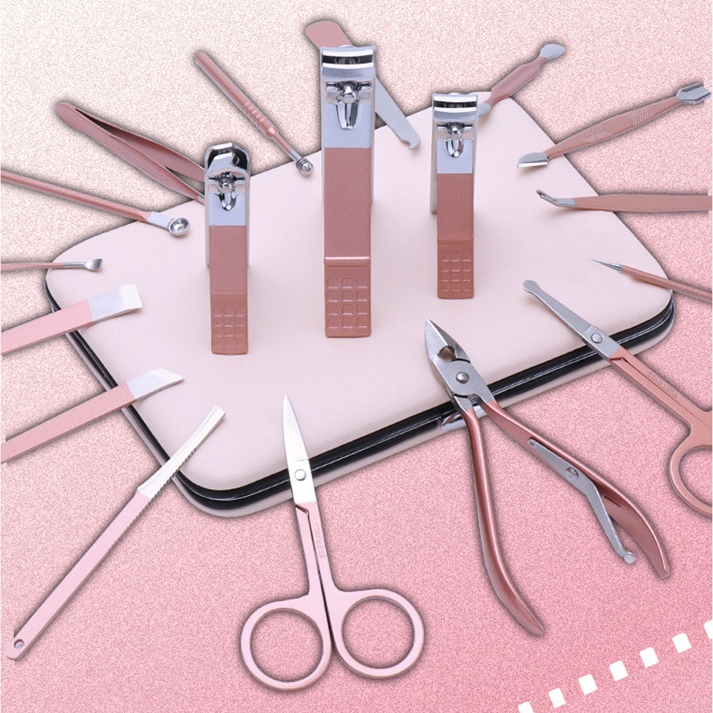 Một bộ gồm 18 miếng dụng cụ làm móng chân, dụng cụ cắt móng tay, tông đơ cắt lớp, dụng cụ cắt lớp biểu bì, dũa móng tay,