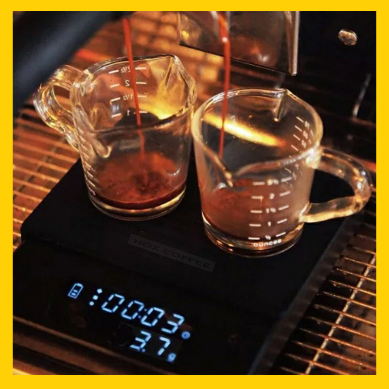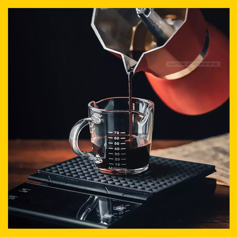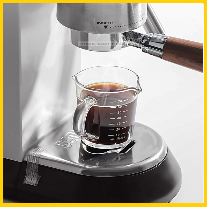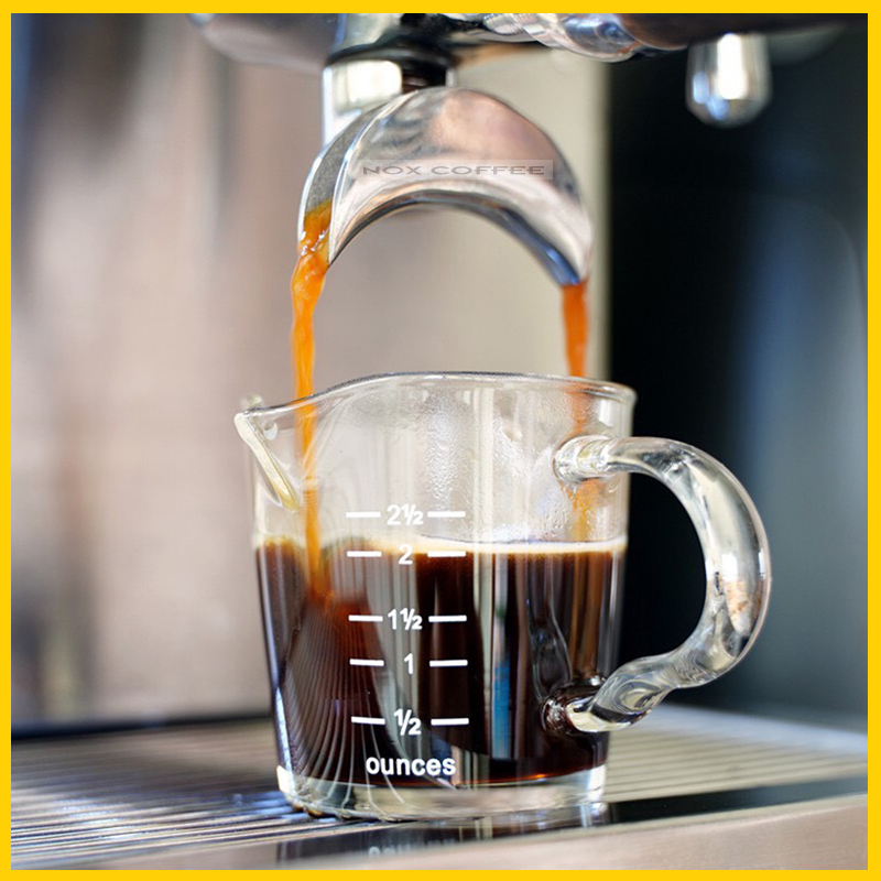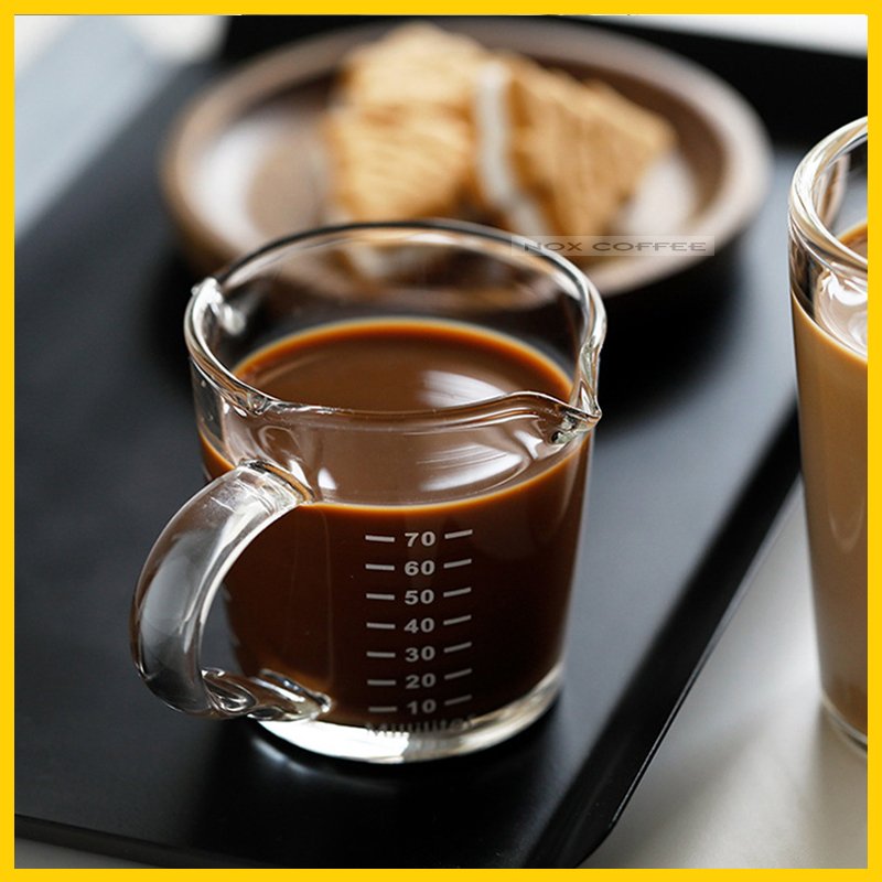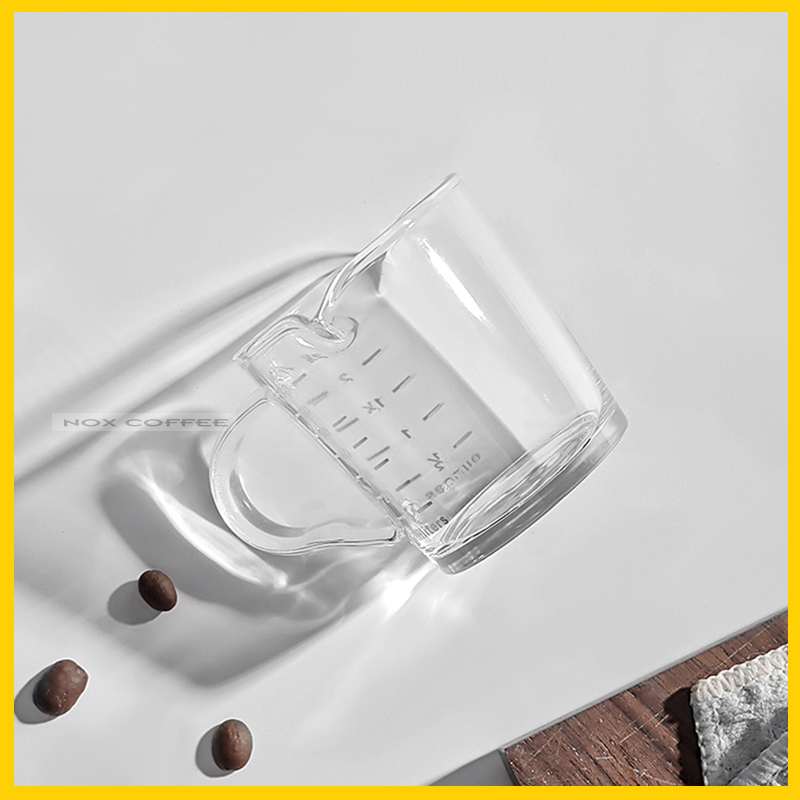 - Ly thủy tinh: có miệng rót đôi , trên thân có vạch ML, giúp quá trình đong pha rót lượng cà phê, sữa, đường cực kỳ tiện dụng, kiểm soát tốt định lượng trong quá trình pha chế