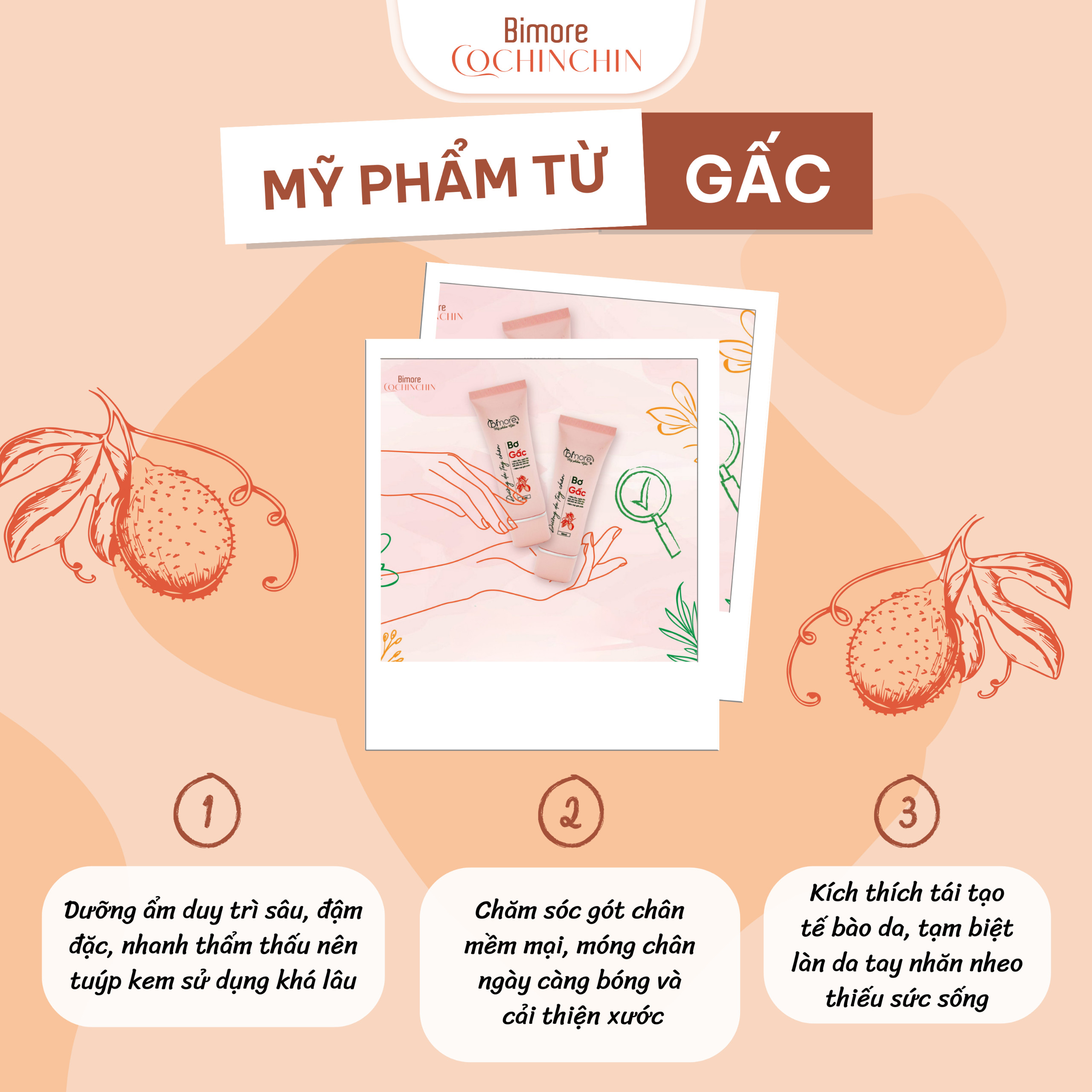 BƠ GẤC DƯỠNG DA TAY CHÂN Số CBMP: 2903/22/CBMP-LA Thành phần chính: Dầu Cám Gạo, Bơ Shea, Dầu Gấc, Hyaluronat, Gel Nha Đam, Dầu Hạt Mè, hương Va-ni. Công dụng: Dưỡng mềm ẩm