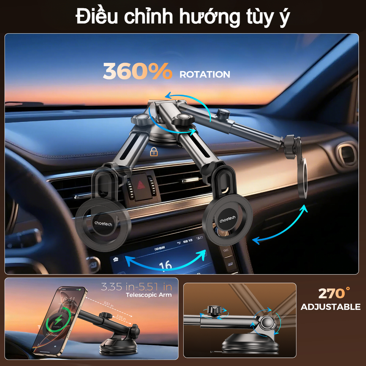 - Tính năng nổi bật: Nam châm lực hút cao, xoay 360 độ, kéo dài cần đỡ, lắp đặt linh hoạt