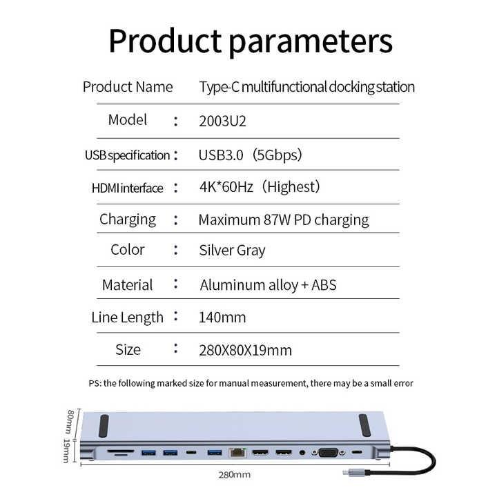 1. Features: Extend more connections from USB Type-c 2. Input: USB Type-C positive 3. Output: 2*usb-c + RJ45 + HDMI 4K60HZ + PD + SD + TF + 2*USB3.0 4. Material: aluminum alloy shell, gold-plated