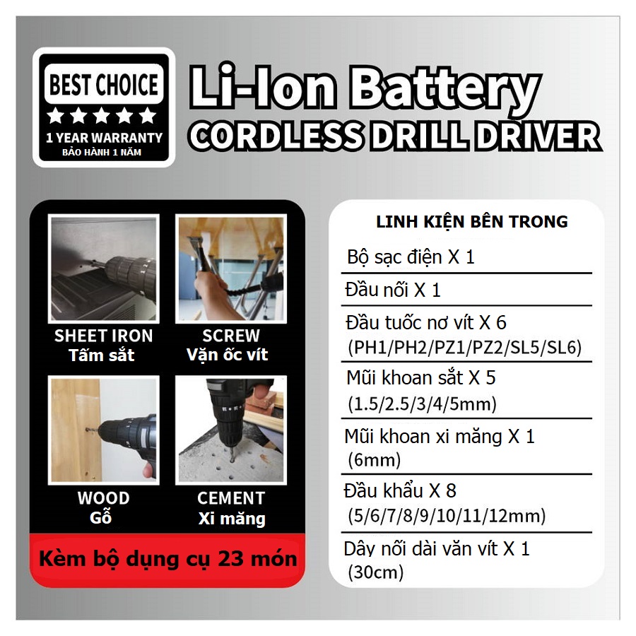 Bộ khoan điện cầm tay chất lượng cao Treny 21V chính hãng – kèm bộ dụng cụ 23 món và bộ sạc - chuyên khoan tường, khoan gỗ, khoan sắt và khoan bê tông.