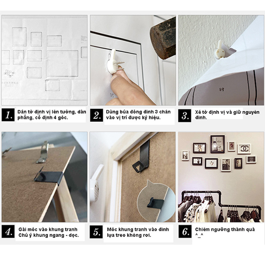 - Không tự ý dùng các dung dịch để tẩy rửa chùi khung ảnh, có thể sử dụng nước lau kính chuyên dụng để lau bề mặt kính cho sáng đẹp. Hướng dẫn Quý khách Tự lắp đặt Khung Hình tại nhà: Quy trình lắp đặt tranh cực kỳ đơn giản trong 5 bước, ai cũng có thể tự lắp tranh trong thời gian vài phút: +) Phụ kiện shop tặng kèm gồm: 1 bộ đinh treo tranh; 1 sơ đồ định vị treo tranh; và móc treo đã gắn sẵn trên khung có thể tháo móc ra điều chỉnh khung ngang dọc tuỳ ý. +) Thao tác: Bước 1: Dán sơ đồ định vị lên tường, cố định 4 góc (vui lòng quan sát kĩ chiều đúng của sơ đồ và dán thẳng ngay ngắn lên tường. Bộ tranh treo đúng đều hay không phụ thuộc nhiều vào sơ đồ) Bước 2: Dùng Búa Đóng đinh 3 chân vào vị trí shop đã đánh dấu bằng các lỗ tròn (dùng búa đóng đều 3 cây đinh cho đến khi đảm bảo 3 cây đinh đã vào tường chắc chắn) Bước 3: sau khi đã đóng tất cả đinh lên các lỗ tròn trên sơ đồ định vị , Xé tờ giấy sơ đồ đi và đinh vẫn giữ nguyên