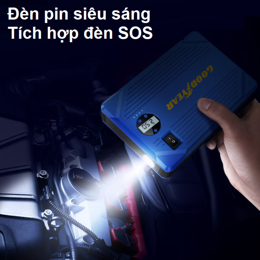 - Nếu chẳng may trên chuyến hành trình mà xe của bạn gặp sự cố hết bình không thể khởi động được, cũng không gần trạm sửa xe hoặc ô tô khác để nhờ kích điện, thì nay bạn vẫn có thể kích nổ cho ô tô của mình bằng kích điện Goodyear GY-5296 Tính năng bơm lốp