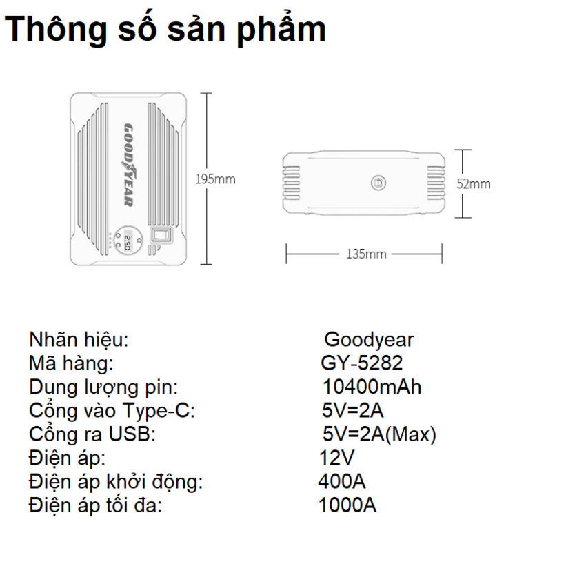 - Được sản xuất từ những linh kiện chất lượng cao với quy trình kiểm soát nghiêm ngặt bộ kích ắc quy ô tô Goodyear GY-5282 có khả năng cung cấp dòng lên đến 1000A (peak current) cho phép khởi động gần như tất cả các dòng xe cá nhân và gia đình hiện nay. - Bên cạnh đó với dung lượng pin lưu trữ lên đến 10400mAh cho phép bạn có thể khởi động đến 30 lần cho một lần sạc đầy pin. Tính năng nổi bật