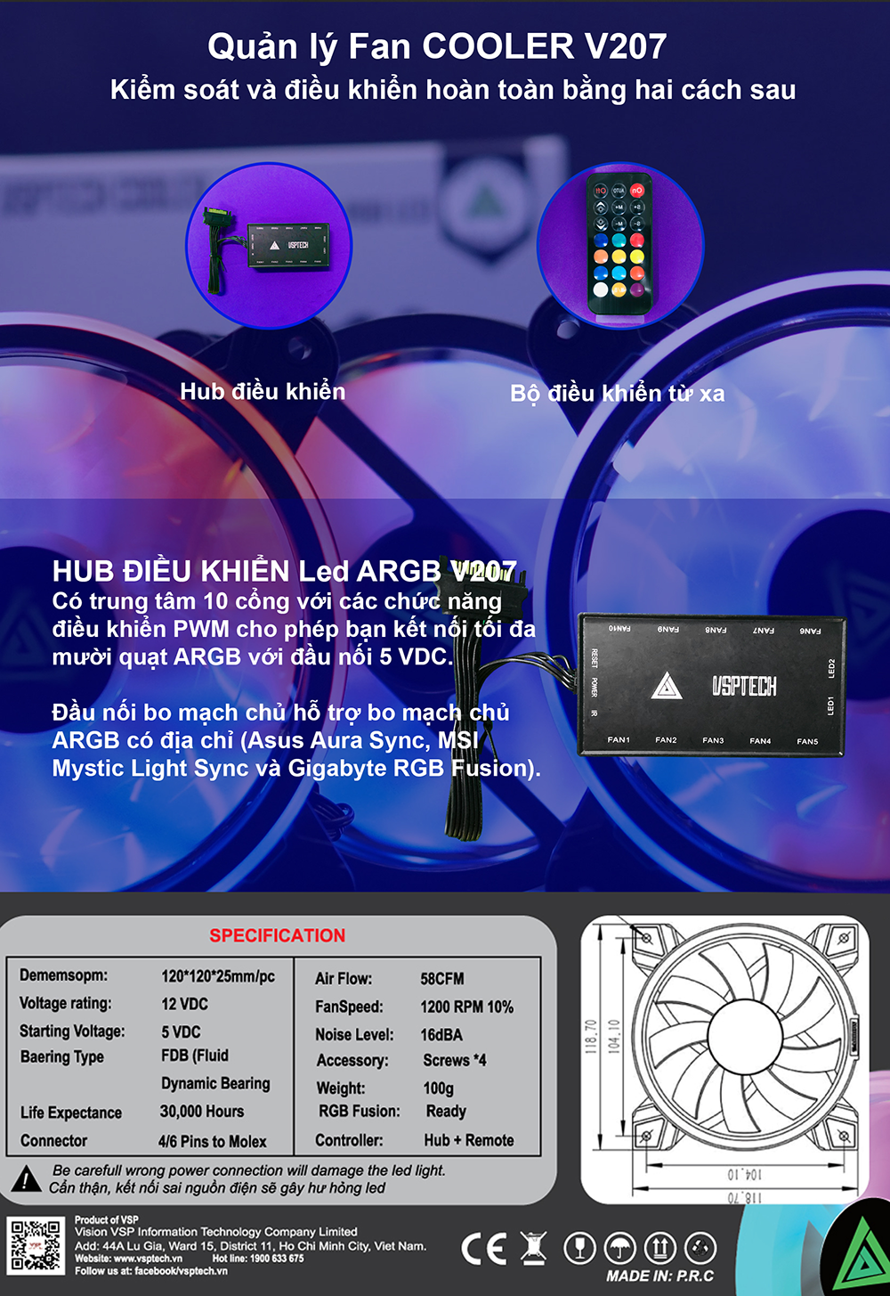 Model: V207 LED: ARGB Kích thước: 120x120x25mm / chiếc Đánh giá điện áp: 12VDC Điện áp khởi động: 5VDC Loại vòng bi: FDB (Vòng bi động chất lỏng) Tuổi thọ : 30.000 giờ Đầu nối: