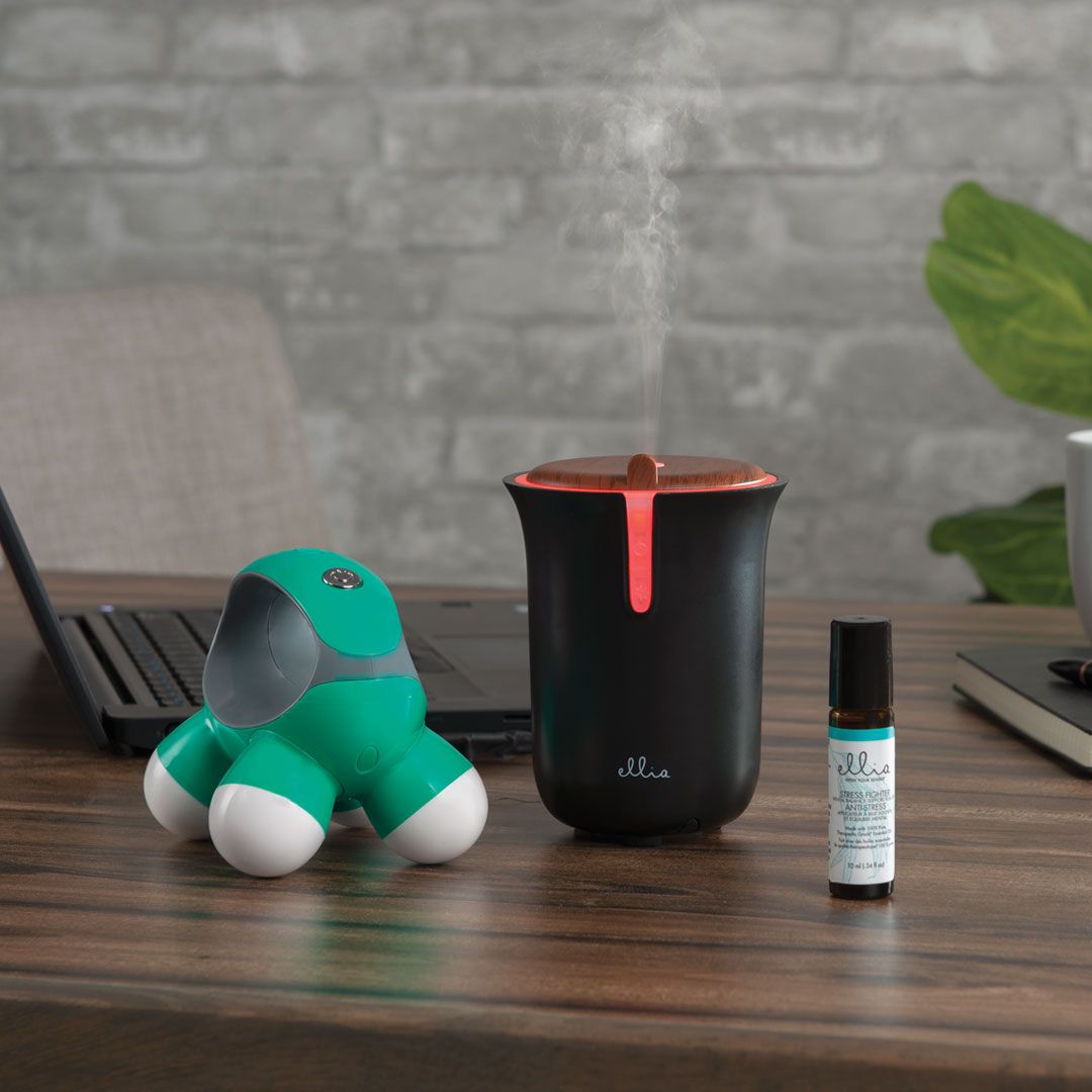 Kết hợp bởi hai thương hiệu số 1 về massage và tinh dầu 01 tinh dầu thiên nhiên Ellia 100% tự nhiên nhập khẩu USA 01 Massage mini HoMedics 4 đầu rung 01 Máy xông tinh dầu siêu âm mini Ellia trên xe hơi , phòng làm việc . Các sản phẩm trong bộ kit có thể được sử dụng riêng lẻ, ở nhà hoặc trên đường đi , du lịch . Kết hợp các liệu pháp trị liệu bằng tinh dầu và massage. Thoa trực tiếp tinh dầu Essential Oil Roll-On lên da để có sự cân bằng tinh thần nhanh chóng và hỗ trợ cảm xúc , giẩm stress tức thì . Sử dụng máy khuếch tán tinh dầu siêu âm Ellia mini với tinh dầu Ellia giúp giảm căng thẳng, chống lại stress , mùi hương yêu thích của bạn sẽ tạo ra không gian lý tưởng giúp bạn cân bằng và sảng khoái . Bên cạnh hương thơm nhẹ nhàng, máy xông tinh dầu siêu âm Ellia có ánh sáng thay đổi màu sắc để phù hợp với tâm trạng của bạn, Nó cũng giúp không gian được bù ẩm nhẹ nhàng. Đổ đầy nước và nhỏ một chút tinh dầu chỉ một lần và tận hưởng 6 giờ chạy liên tục, hoặc 12 giờ không liên tục. Khi liệu pháp trị liệu bằng hương thơm của bạn đang được tiến hành, hãy sử dụng đi kèm Máy massage Mini của HoMedics. Nó cung cấp một massage rung ổn định làm thư giãn cơ bắp và giảm căng thẳng. Điều khiển dễ dàng với tay cầm thoải mái  và hoạt động tốt chỉ với 2 pin AA .