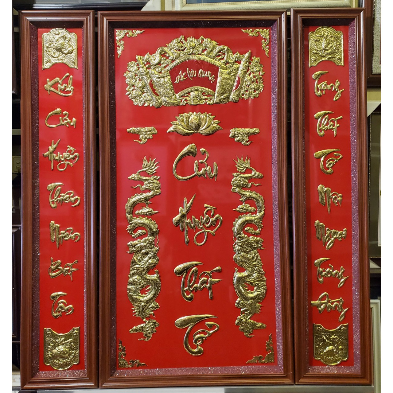 Tranh thờ - Liễn thờ - Cửu huyền thất tổ - tiếng Việt( thờ tổ tiên nội ngoại tương đồng)Chất liệu tranh được chế tác từ đồng vàng nguyên chất ,do các tay thợ làng nghề chế tác chạm khảm hoàn toàn thủ ...