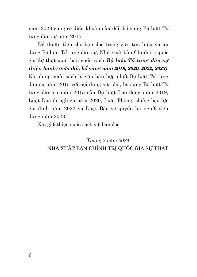 Bộ luật tố tụng dân sự (hiện hành) (sửa đổi bổ sung năm 2019, 2020, 2022, 2023) Tác giả: Quốc Hội NXB: Chính trị Quốc gia Sự thật Công ty phát hành: NXB Chính trị