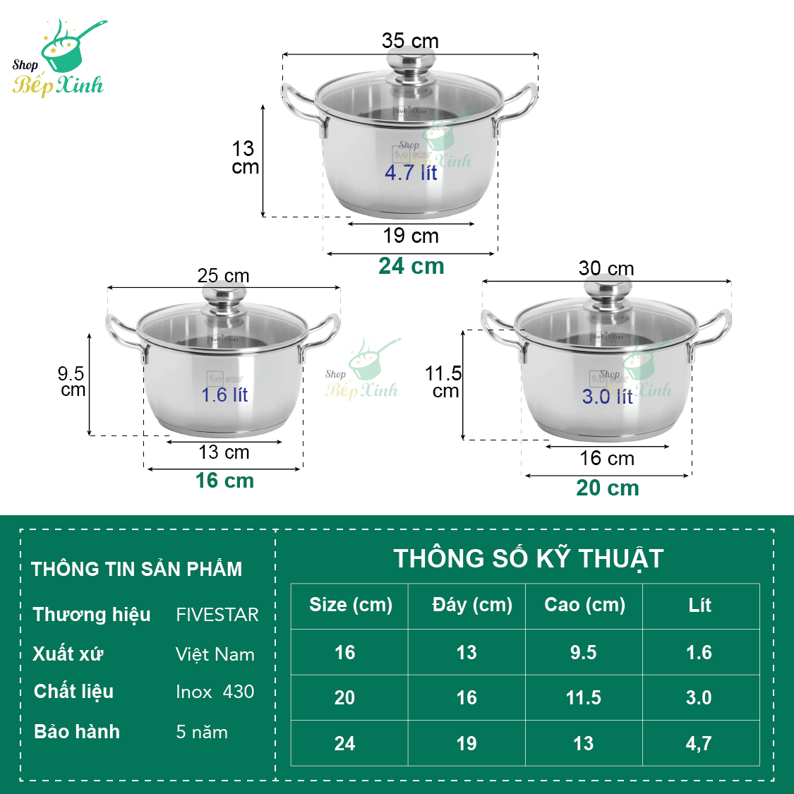 Bộ nồi chảo xửng hấp 3 Đáy Inox 430 cao cấp Fivestar Standard bếp từ nắp kính , tặng 1 vá canh Bộ nồi inox có 9 món gồm : +Quánh có đường kính