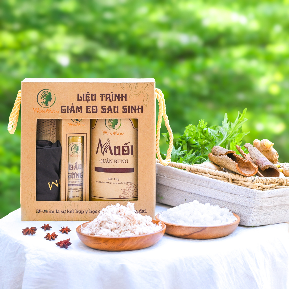 - Sau sinh thường 10 ngày và sinh mổ 20 ngày hết sản dịch, các mẹ massage bụng với dầu gừng rồi quấn muối nóng thảo dược 3 - 4 tiếng mỗi ngày giúp thon gọn eo sau 2 - 3 tuần sử dụng. Mỗi lần sử dụng 1 hộp muối, dùng xong thì đổ ra cho nguội rồi cất lại vào hộp để lần sau dùng lại.