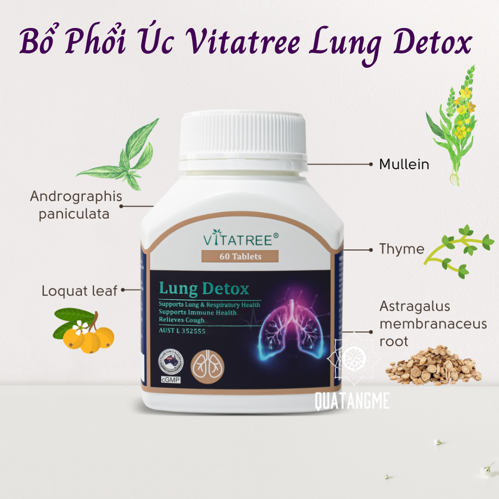 Bổ Phổi Úc Vitatree Lung Detox Giúp Hỗ Trợ Giảm Ho, Tăng Cường Sức Khỏe Hô Hấp, Hỗ Trợ Tăng Cường Sức Đề Kháng Cho Cơ Thể          1.Giới thiệu Bổ Phổi Úc Vitatree Lung Detox 60 Viên        - Phân Loại: Bổ Phổi Úc.        - Thương hiệu: Vitatree.        - Xuất xứ: Úc.        - Đóng gói: 60 viên.        - Vitatree Lung Detox là sản phẩm được chiết xuất từ các thành phần thảo dược thiên nhiên như xuyên tâm liên và các dược liệu khác được sử dụng phổ biến trong y học cổ truyền. Sản phẩm giúp thải độc, cải thiện chức năng phổi, giảm các triệu chứng ho, hô hấp khó khăn, hỗ trợ tăng cường miễn dịch cho hệ hô hấp và cơ thể.       - Giải độc phổi Úc Vitatree Lung Detox 60 viên, là một sản phẩm của Vitatree Australia - thương hiệu thực phẩm chức năng uy tín hàng đầu tại Úc, giúp làm sạch phổi và giữ cho lá phổi khỏe mạnh. Bao bì thay đổi theo từng đợt nhập hàng Bao bì thay đổi theo từng đợt nhập hàng Bao bì thay đổi theo từng đợt nhập hàng        2. Công dụng Bổ Phổi Úc Vitatree Lung Detox 60 Viên         - Phổi là cơ quan chính của hệ hô hấp và vô cùng quan trọng đối với sự sống của con người. Với chức năng trao đổi các loại khí giúp cơ thể giảm khí CO2 và hấp thụ khí O2, phổi thực hiện các chức năng hô hấp, kết hợp với các bộ phận khác của hệ hô hấp, duy trì hoạt động sống của cơ thể. Hơn thế nữa, phổi còn đảm nhận các nhiệm vụ quan trọng như giúp chuyển hóa một số loại chất sinh học, lọc các chất độc tố trong máu ra bên ngoài.         - Có thể thấy phổi là một trong những bộ phận tiếp xúc trực tiếp với môi trường bên ngoài. Khi mũi hít vào thì không khí sẽ đi trực tiếp tới phổi, chính vì thể phổi rất dễ bị tác động bởi môi trường bên ngoài. Nếu phổi được nuôi dưỡng bằng những luồng không khí sạch thì sẽ rất khỏe mạnh. Nhưng ngược lại nếu sống trong môi trường ô nhiễm, nhiều khói bụi thì chức năng của phổi sẽ nhanh chóng bị tàn phá. Vì vậy để duy trì một thể trạng tốt nhất cho cơ thể thì việc chăm sóc và bảo vệ lá phổi là vô cùng quan trọng.         - Vitatree Lung Detox là thực phẩm sức khỏe hỗ trợ giải độc phổi đến từ thương hiệu thực phẩm chức năng uy tín của Úc. Sản phẩm sử dụng cho người trưởng thành, đặc biệt là những người làm việc trong môi trường khắc nghiệt nhiều khói bụi, ô nhiễm, hoặc những người nghiện ốc lá.         - Xuyên tâm liên(Paniculata): Vị thuốc thanh nhiệt, giải độc thường dùng trong y học cổ truyền, xuyên tâm liên có tác dụng kháng vi vi khuẩn, virus và chống viêm. Dùng để hỗ trợ giảm đau họng, cảm cúm và nhiễm trùng đường hô hấp.         - Rễ cây hoàng kỳ(Astragalus): Với tác dụng bổ khí và được lưu truyền từ xa xưa trong dân gian đã dùng rễ hoàng kỳ chữa các bệnh cảm cúm thông thường. Thảo dược này còn có công dụng tăng cường sức đề kháng, hỗ trợ hệ miễn dịch.         - Lá nhót tây hay “Tỳ bà diệp”(Japonica): Theo Đông Y, tỳ bà diệp có vị đắng, tính hơi hàn nên có thể trừ nhiệt, làm mát phổi, giảm ho do phổi nhiệt, hỗ trợ các chứng cảm sốt, ho khan.         - Cỏ xạ hương (Thyme): Là loài thực vật chứa tinh dầu thơm và chất flavonoid chống oxy hóa, tăng cường khả năng miễn nhiễm của đường hô hấp đối với virus hay vi khuẩn. Cỏ xạ hương giúp giảm ho, giảm khó thở, chống co thắt phế quản, làm dịu sự đau rát họng. Trong Y học sử dụng cỏ xạ hương để điều trị ho, cảm lạnh, cúm, viêm phế quản, hen phế quản.         - Vitamin C (axit ascorbic): Là vitamin mà cơ thể cần để hình thành các mạch máu, sụn, cơ và collagen trong xương. Vitamin C đóng vai trò là chất chống oxy hóa, giúp bảo vệ các tế bào chống lại tác động của các gốc tự do. Đây là các phân tử được tạo ra khi cơ thể phân giải thức ăn hoặc tiếp xúc với khói ốc lá và chất ph.óng x.ạ. Các gốc tự do đóng một vai trò trong nguyên nhân gây bệnh tim, ung thư và các bệnh khác. Ngoài ra, vitamin C cũng giúp cơ thể hấp thụ và lưu trữ sắt.         - Thảo bản bông vàng (Mullein): Các hóa chất trong thảo bản bông vàng có thể chống lại virus cúm, herpes và một số vi khuẩn gây viêm đường hô hấp.         - Selen (Selenium): Hỗ trợ hệ thống miễn dịch hoạt động hiệu quả, tăng cường khả năng chống nhiễm trùng, ngăn chặn sự xâm nhập của các tác nhân gây bệnh có hại như vi khuẩn, virus.        Công dụng của Bổ Phổi Úc Vitatree Lung Detox 60 viên:         - Giúp cải thiện các chức năng của phổi.         - Giúp thải độc lá phổi một cách an toàn, hiệu quả.         - Hỗ trợ lá phổi ‘’thở ‘’ tốt hơn, hô hấp khỏe mạnh hơn.         - Giúp giảm các triệu chứng ho, hô hấp khó khăn.         - Hỗ trợ tăng cường miễn dịch cho hệ hô hấp và cơ thể.        3. Thành phần B