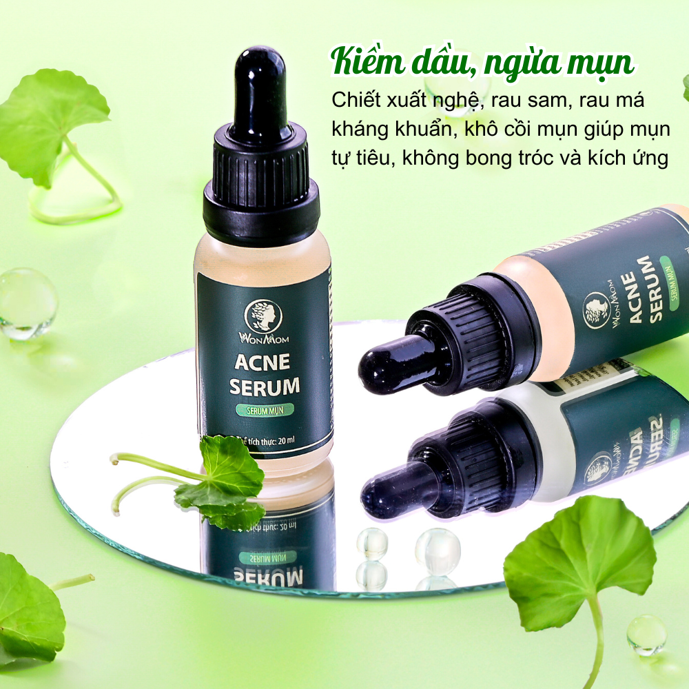- Serum mụn Wonmom được chiết xuất rau má, lộc đề, ZinC bum, vitamin B5 giúp kiềm dầu, khô cồn mụn, tiêu nhân mụn.