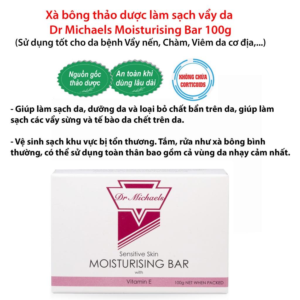 Dr Michaels Moisturising Bar với Vitamin E với công thức gồm các thành phần nhẹ nhàng, thích hợp cho làn da nhạy cảm. Công thức độc đáo này có thể sử dụng để làm sạch da mặt. Nó có thể hỗ trợ trong việc bổ sung thêm các loại dầu tự nhiên cho da, do đó giúp cho làn da thô, khô và dễ bong tróc thêm mềm mại và dẻo dai. Các loại tinh dầu chứa trong Dr Michaels Moisturising Bar có lợi trong việc làm dịu làn da bị kích thích và nhạy cảm.
