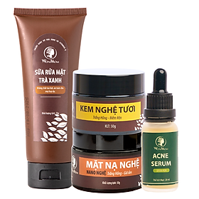 Bộ sản phẩm bao gồm: 1 Sữa rửa mặt trà xanh 70g + 1 Kem nghệ tươi 50g + 1 Serum mụn 20ml + 1 Mặt nạ nghệ 50g