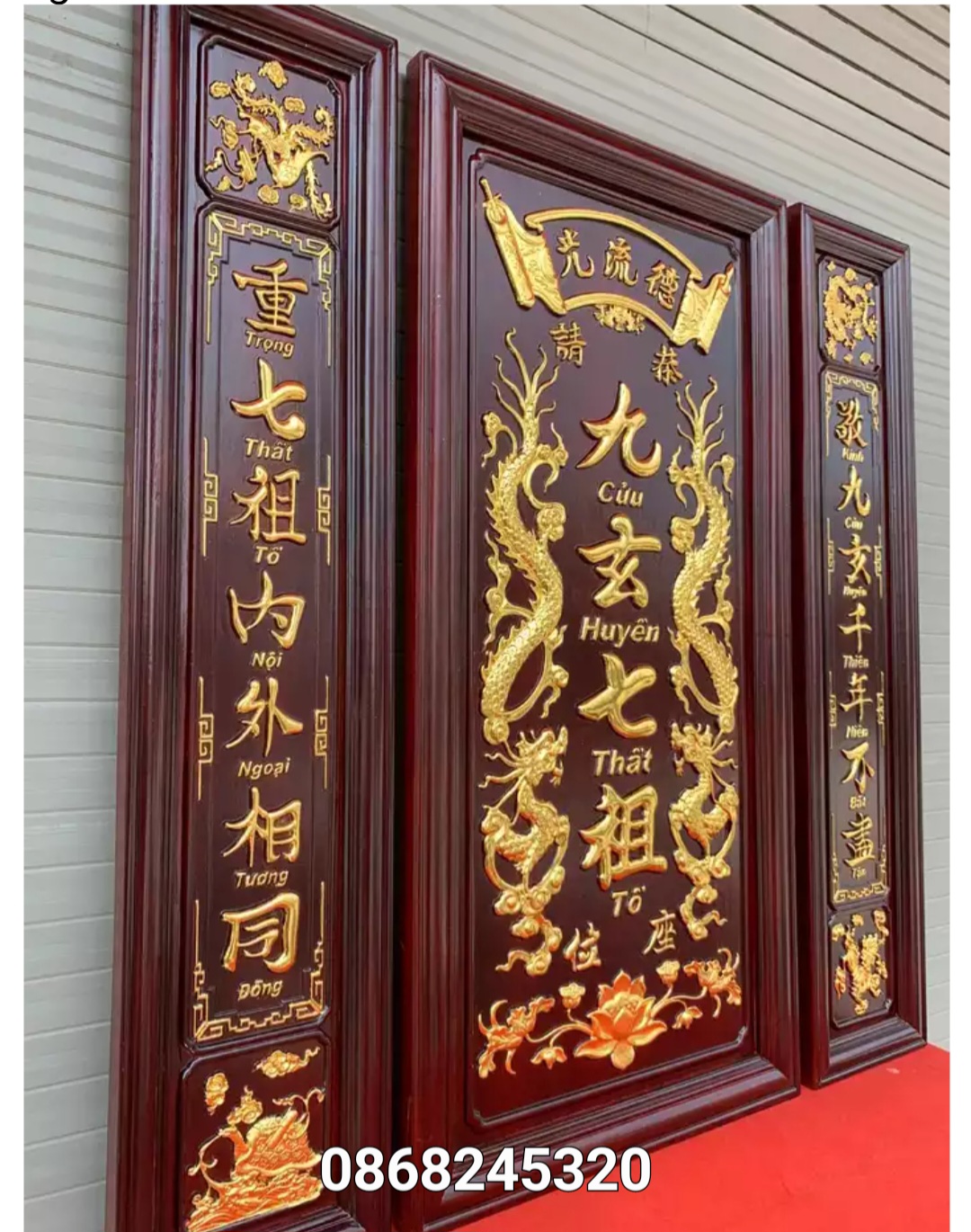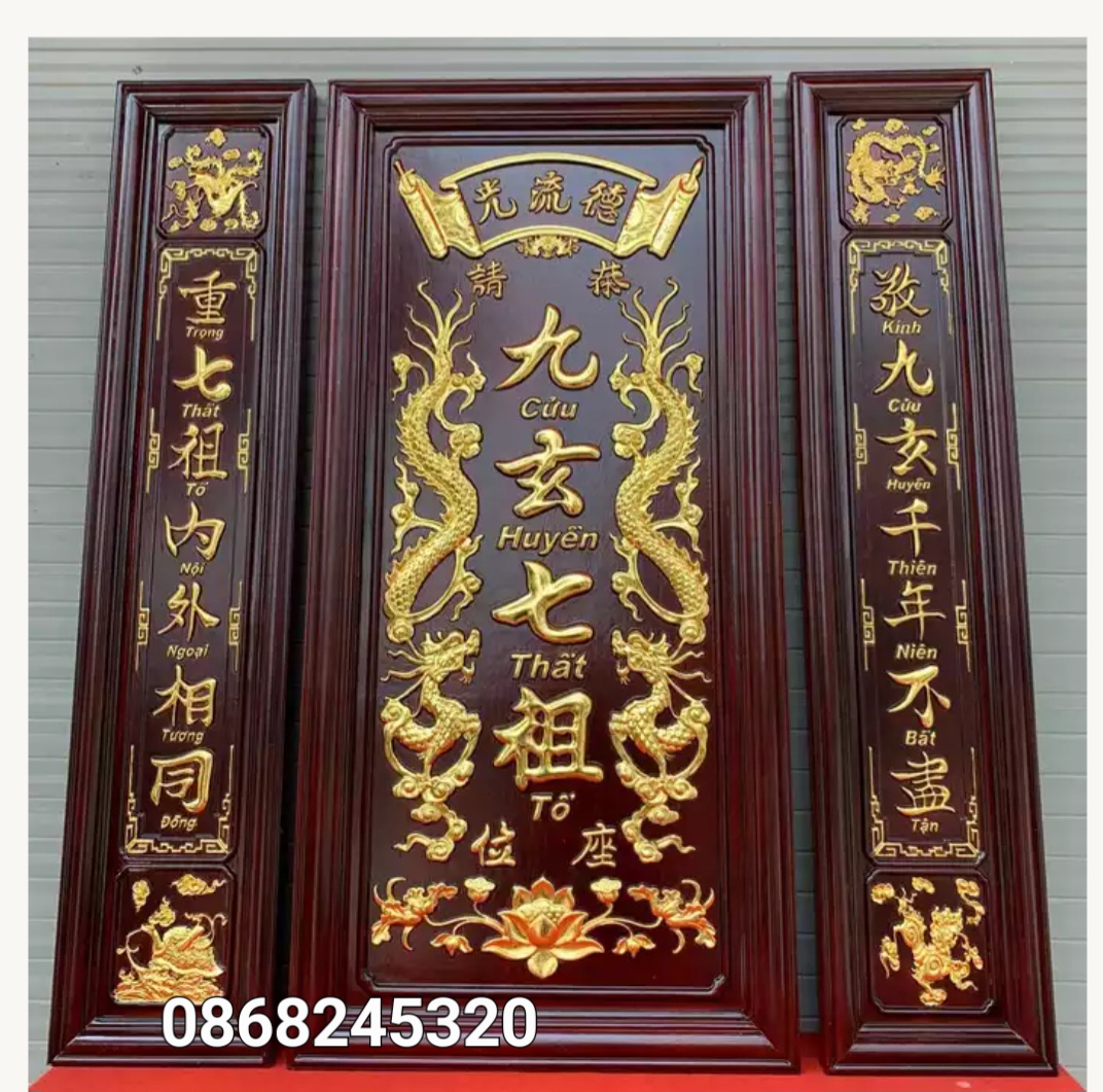 Bộ liễn thờ gia tiên -Cửu Huyền Thất Tổ bằng gỗ hương đá Chất liệu tranh được chế tác bàng gỗ hương ván liền tấm đục nổi mạ vàng sơn PU. Cam kết gỗ lục