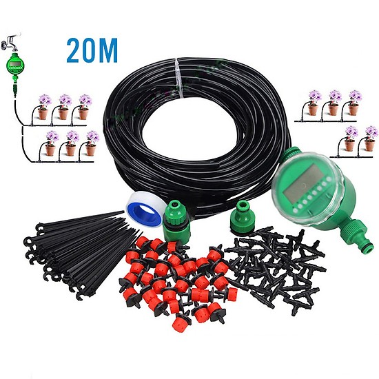 Bộ tưới cây tự động 20 béc nhỏ giọt kèm van nước hẹn giờ là 1 hệ thống tưới nhỏ giọt đơn giản nhưng đầy đủ và dễ sử dụng. Nó được thiết kế để đáp ứng nhu cầu tưới nhỏ giọt cho vườn nhỏ ( dưới 20 chậu ) của bạn. Hệ thống tưới nhỏ giọt đơn giản bao gồm tất cả các phần cần thiết cho 1 hệ thống tưới nhỏ giọt có thể dễ dàng lắp ráp bằng cách riêng của bạn mà không cần bất kỳ công cụ đặc biệt. Bạn chỉ phải bận rộn 1 lần, sau đó là chuỗi ngày tưới cây nhàn nhã thư thả. Hệ thống tưới bao gồm cả đồng hồ hẹn giờ tự động, bạn có thể kết nối với nguồn nước máy áp lực khỏe tương đối hoặc téc nước từ trên cao (>2m) hoặc bơm tăng áp tự động là hệ thống có thể hoạt động.