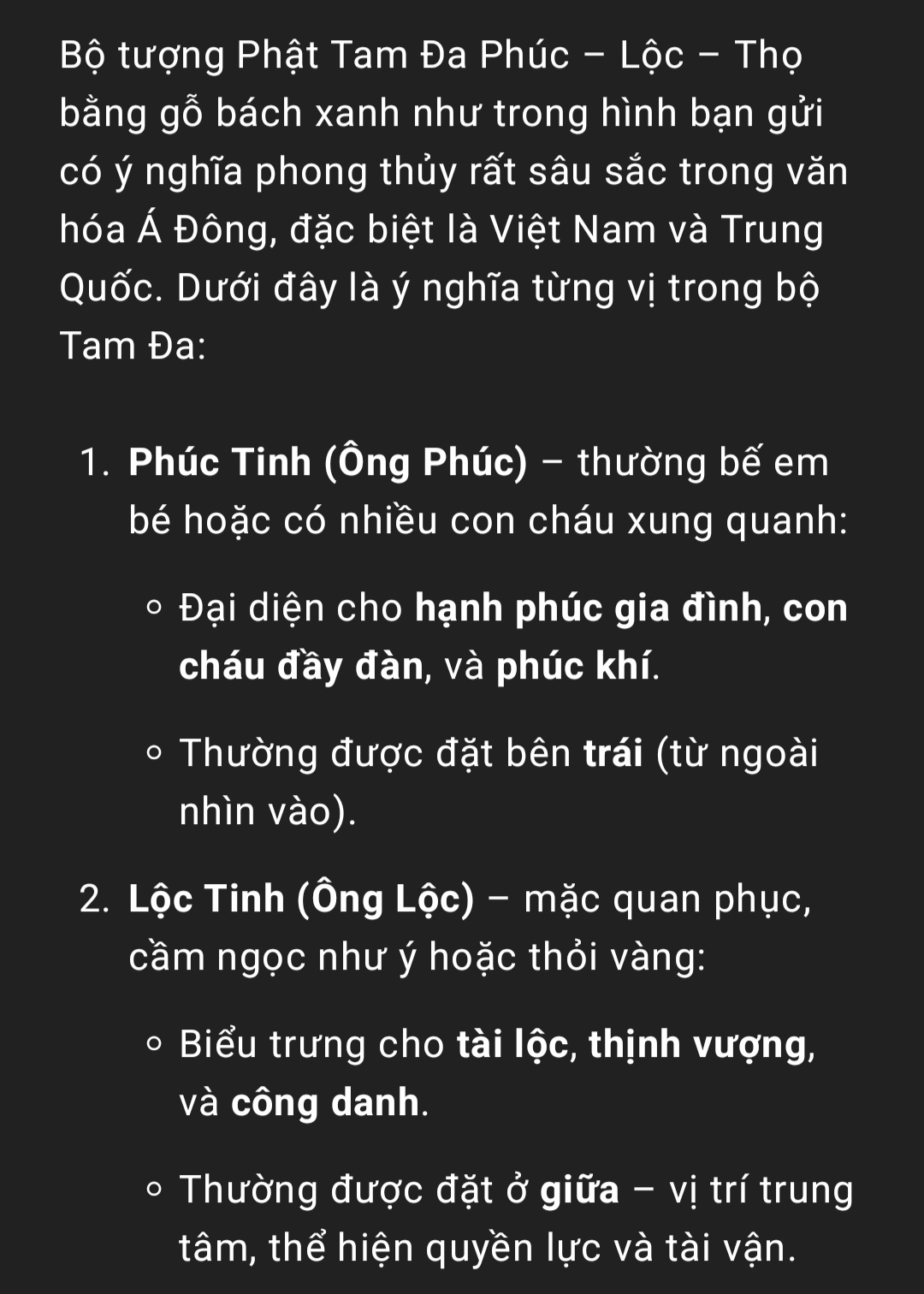 Mua tại TiktokBộ tượng phật tam đa phúc lộc được làm bằng chất liệu gỗ bách xanh liền khối tự nhiên 100% Kt cao 40x13x11cm _ Tượng được chạm khắc vô cùng tỉ mỉ tinh xảo kỳ công.Đi hầu hết tất cả mọi chi tiết góc ngách nội dung hoa văn của tượng đều được gọt tỉa chỉnh sửa sắc nét hoàn toàn bằng tay thủ công truyền thống.