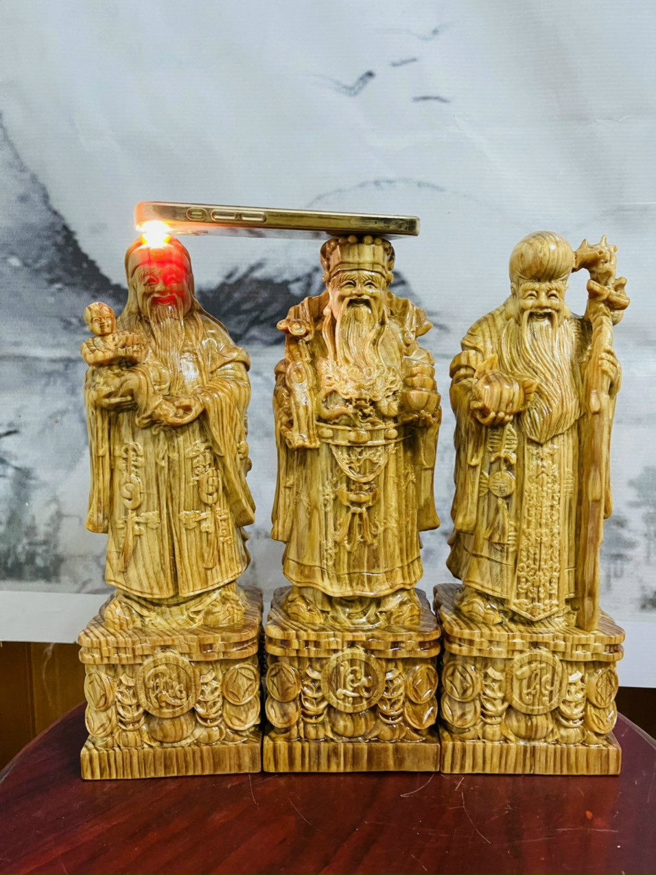 Tượng tam đa phúc lộc thọ làm bằng gỗ huyết long