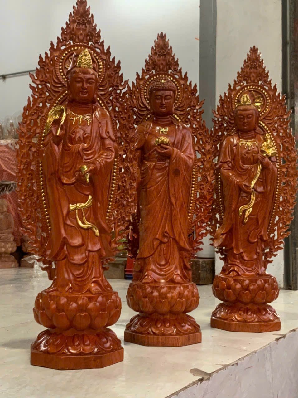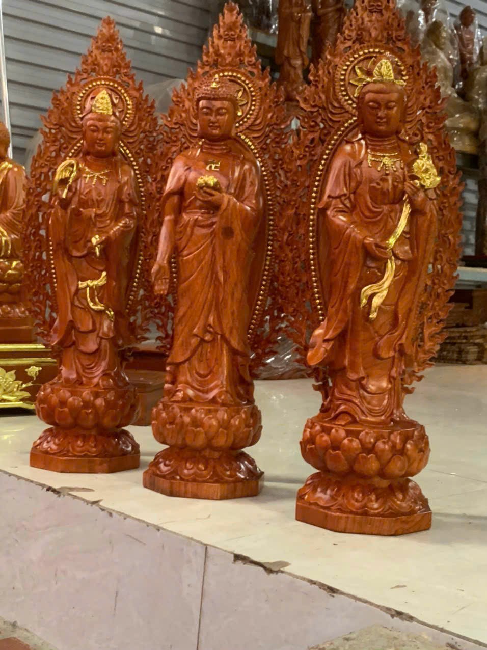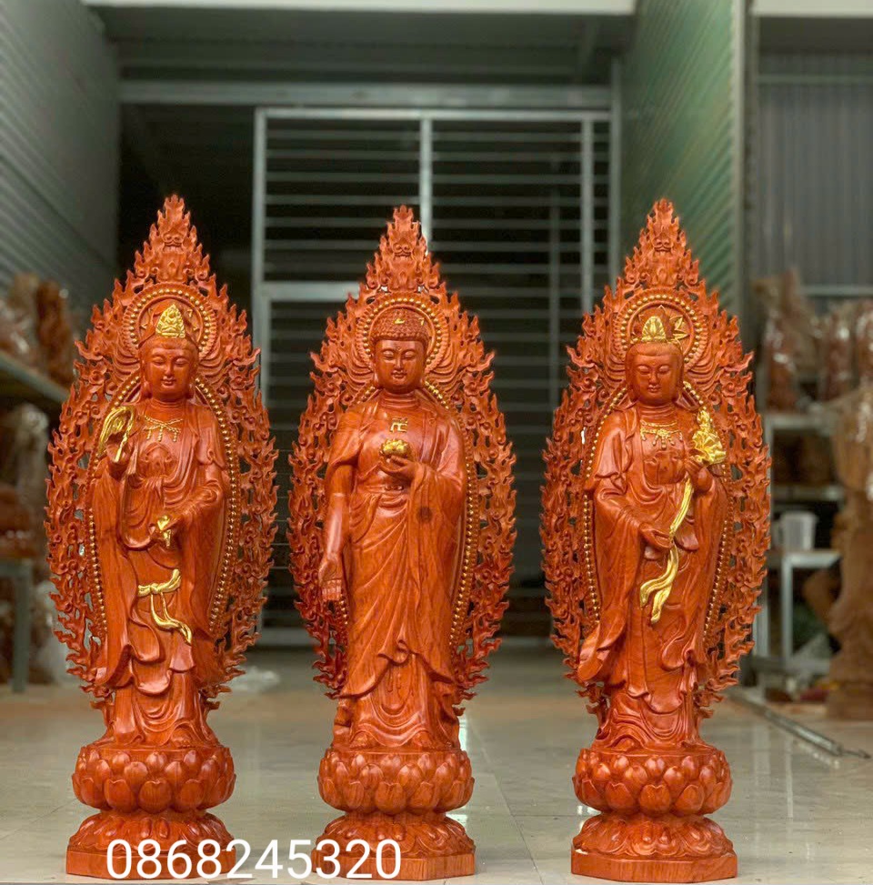 Cách lập ban thờ Tây Phương Tam Thánh. Bộ tượng Tam Thánh Phật đứng cao 60cm gỗ hương đá