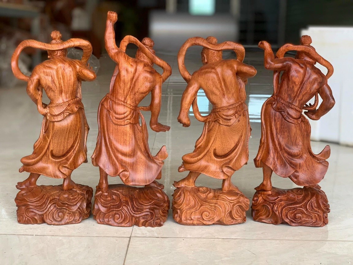 _ Bộ tượng tứ đại kim cương được  trạm khắc vô cùng tỉ mỉ tinh sảo kỳ công .Đi hầu hết tất cả mọi chi tiết góc ngách nội dung hoa văn của tượng đều được ngọt tỉa chỉnh sửa hoàn toàn bằng tay thủ công .Đồng thời tượng được kiểm định vô cùng khắt khe ,Như cho vào thẩm sấy cho gỗ khô kiệt .Mục đích trống dập nứt vênh mo mối mọt song cho vào trà nhám, cho sạch sẽ sờ mát lạnh song cho vào  ,phun lót làm bóng mờ để giữ lại mầu sắc vân gỗ tự nhiên ,Tượng được làm và hoàn thiện do bàn tay khối óc tài hoa ,Từ những người thợ giàu kinh nghiệm cũng như tay nghề cao trong làng nghề truyền thống .Tượng được làm và hoàn thiện do bàn tay khối óc tài hoa ,Từ những người thợ giàu kinh nghiệm cũng như tay nghề cao trong làng nghề truyền thống ,Chính  vì thế bộ tượng tứ đại kim cương đã đáp ứng đầy đủ những tiêu trí ( Đẹp bền rẻ ) Thẩm mỹ nghệ thuật với chất lượng tuyệt vời