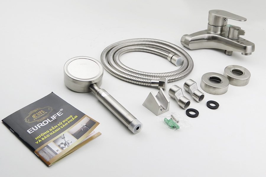 - Bộ sen được đi kèm bộ dây tay sen siêu tăng áp, 1 chế độ chảy Eurolife