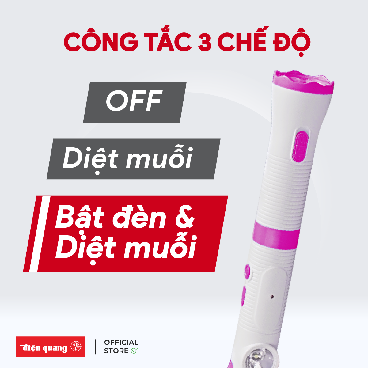 - Đặc biệt, vợt muỗi Điện Quang có đèn LED và đèn báo có điện thông minh. Cùng với công tắc mở điện linh hoạt trên thân vợt giúp người dùng thao tác dễ dàng khi bật hoặc tắt.