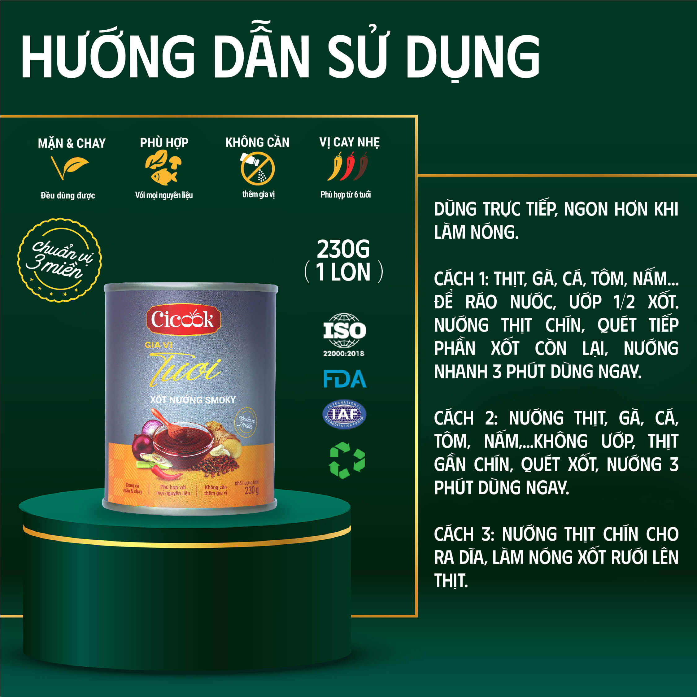 THÔNG TIN VỀ SẢN PHẨM   Lon Xốt Nướng Mắc Khén Smoky CiCook được lấy cảm hứng từ mắc khén, loại gia vị đặc trưng của vùng núi Tây Bắc Việt Nam, kết hợp với công nghệ tạo hương khói trực tiếp trong hỗn hợp gia vị, tạo ra trải nghiệm ẩm thực nướng độc đáo, đậm đà và quyến rũ. CiCook muốn mang đến sản phẩm gia vị nướng độc đáo và chất lượng cao, vừa tiện lợi vừa tôn vinh hương vị ẩm thực Việt Nam, giúp giới trẻ tự tin sáng tạo món ăn ngon ngay tại nhà hoặc tại các buổi tiệc.   Lon Xốt Nướng Mắc Khén Smoky CiCook có những điểm nổi bật về: Hương vị độc đáo: khác biệt hoàn toàn với các loại Xốt BBQ và gia vị nướng thông thường, Xốt Nướng Mắc Khén Smoky không chỉ mang đến hương vị khói tự nhiên mà còn chứa đựng nét văn hóa ẩm thực độc đáo từ mắc khén, tạo nên một trải nghiệm ẩm thực khó quên. Công nghệ ám khói: Xốt Nướng Mắc Khén Smoky sử dụng công nghệ hiện đại để ám khói trực tiếp vào hỗn hợp gia vị, tạo ra hương khói tự nhiên như khi nướng trên lửa than thông thường. Công nghệ này giữ nguyên hương vị khói đậm đà trong mỗi muỗng Xốt, giúp món nướng trở nên quyến rũ mà vẫn an toàn và tiện lợi.   Không phụ gia nhân tạo: trong khi nhiều sản phẩm gia vị nướng khác trên thị trường chứa chất bảo quản và phụ gia nhân tạo, sản phẩm của chúng tôi cam kết từ nguyên liệu tự nhiên, đảm bảo an toàn cho sức khỏe người tiêu dùng.   Sự kết hợp văn hóa và hiện đại: sản phẩm không chỉ mang tính tiện lợi, hiện đại mà còn tôn vinh giá trị văn hóa bản địa Việt Nam – một điểm đặc biệt khiến Xốt Nướng Mắc Khén Smoky nổi bật trên thị trường quốc tế.   Bao bì: đựng trong lon thiếc sang trọng, giữ được hương vị nguyên bản và dễ bảo quản. Thiết kế hiện đại phù hợp với phong cách sống trẻ trung và năng động.
