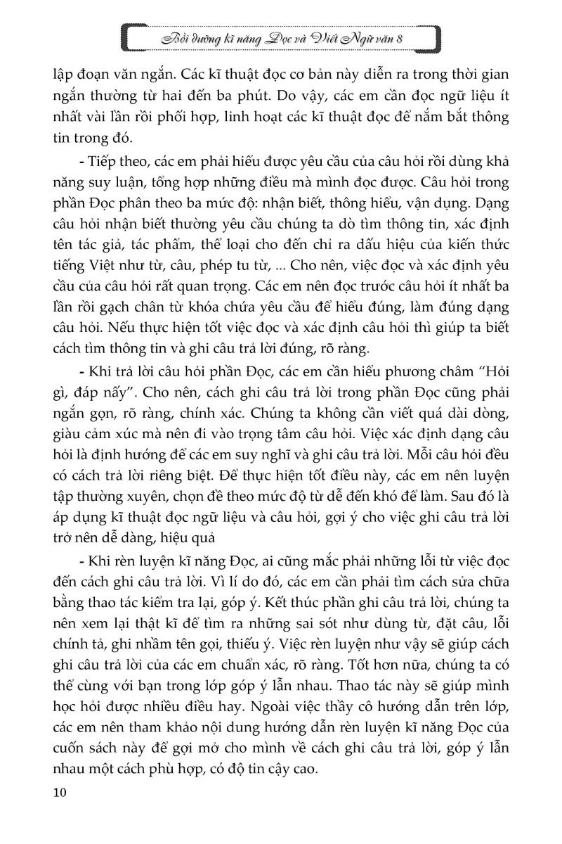 Cuốn sách “BỒI DƯỠNG KĨ NĂNG ĐỌC VÀ VIẾT NGỮ VĂN 8” sẽ giúp học sinh rèn luyện, phát triển kĩ nǎng Đọc, Viết, định hướng cách làm bài hiệu quả, phù hợp. Các em dễ tiếp cận, nắm được cách làm bài tập Đọc, Viết trong chương trình Ngữ vǎn lớp 8 mới, cải thiện, phát triển tư duy ngôn ngữ qua việc tự rèn luyện hai kĩ nǎng quan trọng (đọc, viết) khi học môn Ngữ vǎn. Thông qua mỗi đề luyện tập, học sinh có thể mở rộng vốn hiểu biết của bản thân về những vấn đề trong cuộc sống liên quan đến các chủ đề, bồi đắp tình yêu quê hương, đất nước nói chung, vǎn chương nói riêng đồng thời biết giữ gìn, phát huy giá trị của tiếng Việt đối với đời sống hiện nay. Cuốn sách “BỒI DƯỠNG KĨ NĂNG ĐỌC VÀ VIẾT NGỮ VĂN 8” còn là nguồn tài liệu bổ ích để các thầy cô có thể tham khảo, hướng dẫn học sinh rèn luyện kĩ nǎng Đọc và Viết thật hiệu quả.   Sách bao gồm các phần sau: