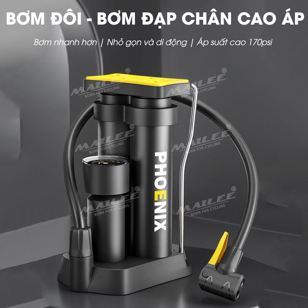 Bơm Chân Mini Di Động Phoenix 9809E cho Xe máy/ xe đạp/ xe ô tô, ống đôi, 170 psi, vỏ nhựa ABS, lõi bơm nhôm, van đa năng 2 lỗ đa dụng - Mai Lee
