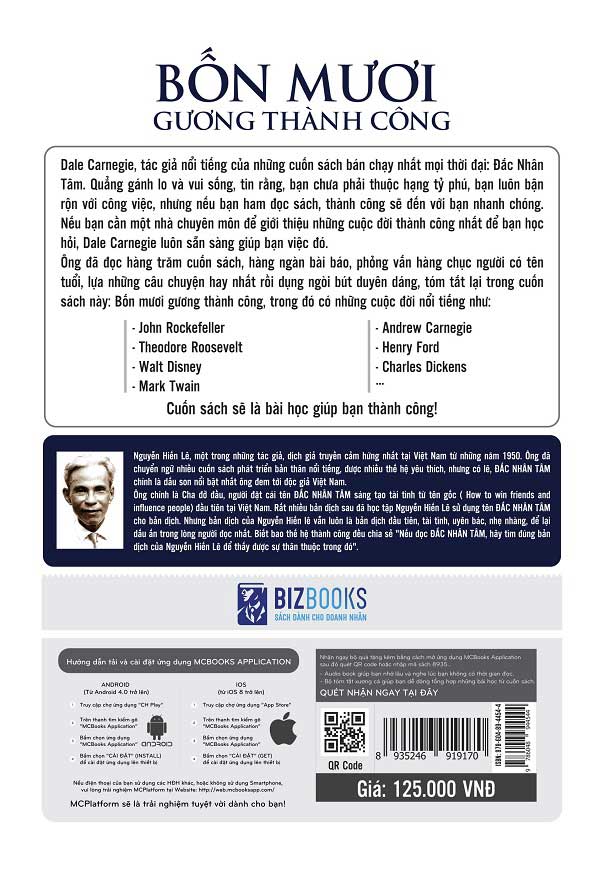 - Henry Ford: Cha đẻ của hãng xe hơi nổi tiếng FORD. Câu chuyện bị kiện và chống án thành công nhờ sự ủng hộ của quần chúng. Và nhiều những tấm gương khác nữa . Thông qua câu chuyện của 40 tấm gương này, bạn đọc sẽ hiểu được lý do vì sao họ thành công, để thành công họ cần trang bị những gì. Đó đều là những câu chuyện người thật việc thật trong thực tế. Nếu bạn có thể thất bại luôn năm mười năm mà vẫn chịu đói chịu rét để viết, như Zane Grey, Somerset Maugham, nếu bạn có thể xin việc mười tám lần mà cũng không chán nản như Eddie Rickenbaker, thì chắc thì sớm muộn gì bạn cũng thành công. Con đường tới thành công càng nhiều trở ngại bao nhiêu thì ý chí của bạn càng được tôi luyện, khả năng của bạn càng được phát triển bấy nhiêu. Qua câu chuyện về những tấm gương này, bạn sẽ tự rút ra được những bài học và tự soi vào bản thân xem mình đang thiếu gì, cần bổ sung những gì để đạt được những thành công như họ. Hãy học cách nhìn vào người thành công và tự nhìn nhận, liên hệ thực tiễn vào mình để bản thân ngày một phát triển. Bạn đọc hãy nhanh tay sở hữu cuốn sách này để có thể học cách thành công từ 40 tấm gương mà Dale Carnegie muốn truyền tới các bạn. MỤC LỤC VỀ TÁC GIẢ Dale Carnegie sinh ra ở Missouri (Mỹ) vốn là người chăn nuôi nghèo nhưng ham học. Ông là cuốn sách bán chạy nhất mọi thời đại: Đắc nhân tâm, Quẳng gánh lo đi và vui sống. Ở trường ông học có 600 học sinh nhưng ông là 1 trong 6 học sinh nghèo nhất. Tốt nghiệp ra ông bắt đầu tranh đấu gay go, thử nhiều nghề : bán bài học theo lối hàm thụ, bán mỡ và xà bông, có hồi lại học diễn kịch, rồi bán cam nhông. Sau ông lựa nghề dạy học trong một lớp huấn luyện con người để kiếm sống. Chỉ 3 năm sau, danh tiếng của ông vang khắp nước mỹ. Người ta có thể nói ông là một trong số những người đã khởi xướng phong trào huấn luyện người lớn, một phong trào hiện đang thịnh hành ở Mỹ và lan dần khắp thế giới Nguyễn Hiến Lê là một tác giả, dịch giả truyền cảm hứng nhất Việt Nam từ những năm 1950 Ông đã chuyển ngữ nhiều cuốn sách phát triển bản thân nổi tiếng, được nhiều thế hệ yêu thích, nhưng có lẽ Đắc Nhân Tâm chính là dấu son nổi bật nhất ông đem tới độc giả Việt Nam. Ông chính là cha đỡ đầu, người đặt cái tên Đắc Nhân Tâm sáng tạo tài tình từ tên gốc How to friends and influence people đầu tiên tại Việt Nam. Rất nhiều bản dịch sau đã học tập Nguyễn Hiến Lê sử dụng tên Đắc Nhân Tâm cho bản dịch. Nhưng bản dịch Đắc Nhân Tâm của Nguyễn Hiến Lê là bản dịch đầu tiên, tài tình, uyên bác, nhẹ nhàng, để lại dấu ấn trong lòng người đọc nhất. TÁC GIẢ, DỊCH GIẢ NGUYỄN HIẾN LÊ Người dịch ĐẮC NHÂN TÂM đầu tiên tại Việt Nam được yêu thích nhất! -> Ông là người đầu tiên đặt cái tên Đắc Nhân tâm sáng tạo tài tình từ tên gốc ( How to win friends and influence people) . Vì thế các bạn dịch sau đều học tập dùng cho bản dịch. Khi đọc các tác phẩm dịch của Nguyễn Hiến Lê độc giả yêu thích cách hành văn của ông -> Ông từng chia sẻ: "Cái giá trị của một người không đo bằng địa vị, bằng bằng cấp mà bằng sự có ích của người đó với đồng bào, xã hội ngoài công việc mà người đó làm để mưu sinh" -> Ông là một nhà văn, dịch giả, nhà ngôn ngữ học, nhà giáo dục và hoạt động văn hóa độc lập, với 120 tác phẩm sáng tác, biên soạn và dịch thuật thuộc nhiều lĩnh vực khác nhau như giáo dục, văn học, ngữ học, triết học, lịch sử, du ký, gương danh nhân, chính trị, kinh tế, Nếu chọn sách Dale Carnegie thì chỉ nên tìm đọc đúng dịch giả Nguyễn Hiến Lê? Bởi vì: Thứ nhất, Ông là NGƯỜI ĐẦU TIÊN TẠI VIỆT NAM Người đầu tiên đặt cái tên Đắc Nhân tâm sáng tạo tài tình từ tên gốc ( How to win friends and influence people) . Vì thế các bạn dịch sau đều học tập dùng cho bản dịch. Thứ hai, DỊCH GIẢ ĐƯỢC YÊU THÍCH NHẤT Không đơn thuần là một bản dịch kiểu chuyển ngữ mà Nguyễn Hiến Lê đã việt hóa tác phẩm, đưa vào nhiều ví dụ, dẫn chứng sinh động, dễ hiểu…. chính vì vậy ông là dịch giả truyền cảm hứng nhất và được độc giả yêu thích nhất. Thứ ba, QUYỂN SÁCH ĐỨNG ĐẦU DANH SÁCH BÁN CHẠY NHẤT MỌI THỜI ĐẠI Đây là quyển sách đầu tiên và hay nhất, có ảnh hưởng làm thay đổi cuộc đời của hàng triệu người trên thế giới. . Mỗi thế hệ đều cảm nhận, khám phá từ quyển sách cách tư duy, cách ứng xử và cách sống mới mẻ, thú vị và rất hữu ích cho cuộc sống của chính