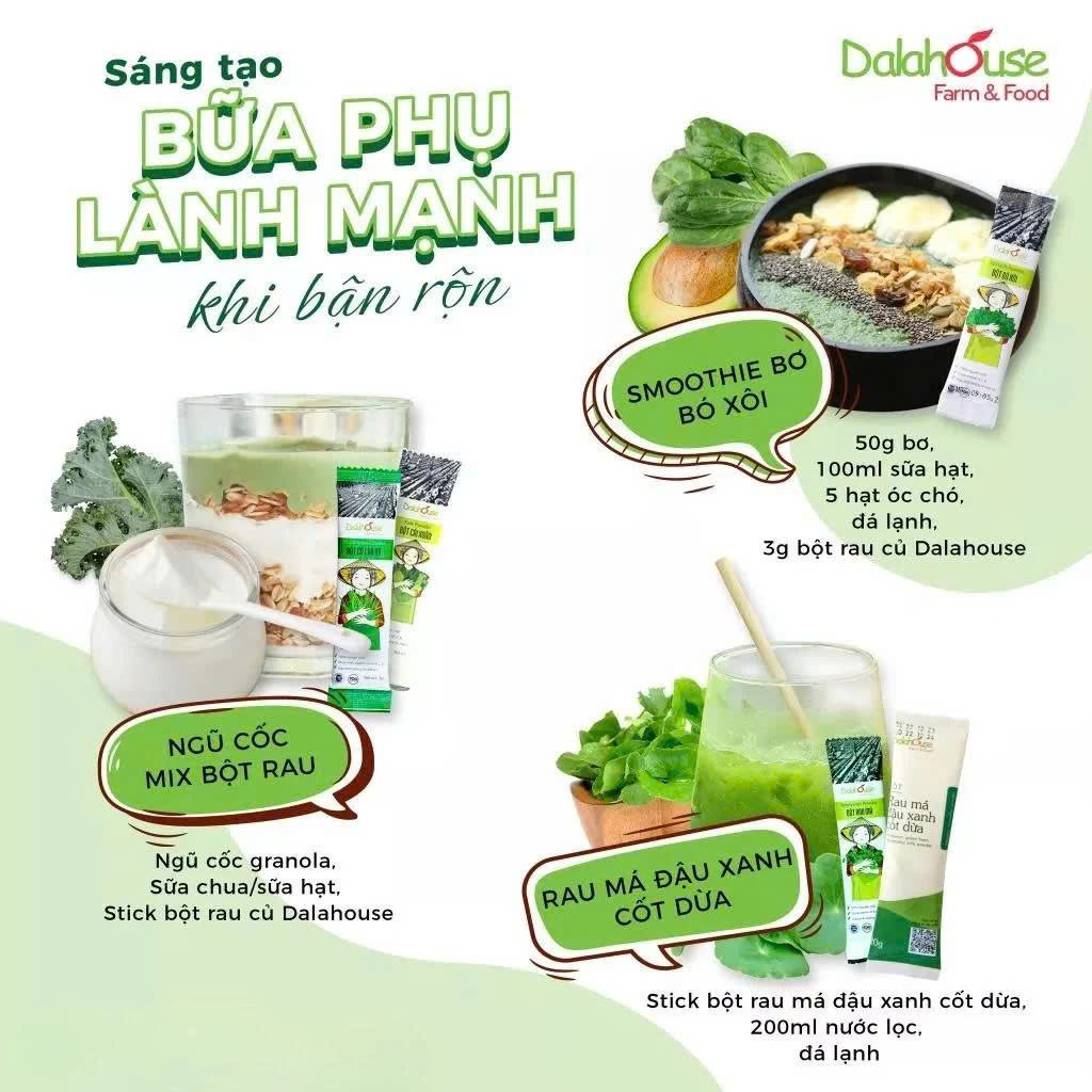 - Làm nước uống thải độc: Pha 1 gói 3g (hoặc 1 muỗng cafe bột) với 300ml-500ml nước lọc/ấm, lắc đều và uống trước bữa ăn 30 phút hoặc sau ăn 2h (người bệnh dạ dày uống sau ăn). ƯU ĐIỂM VƯỢT TRỘI của bột rau củ Dalahouse