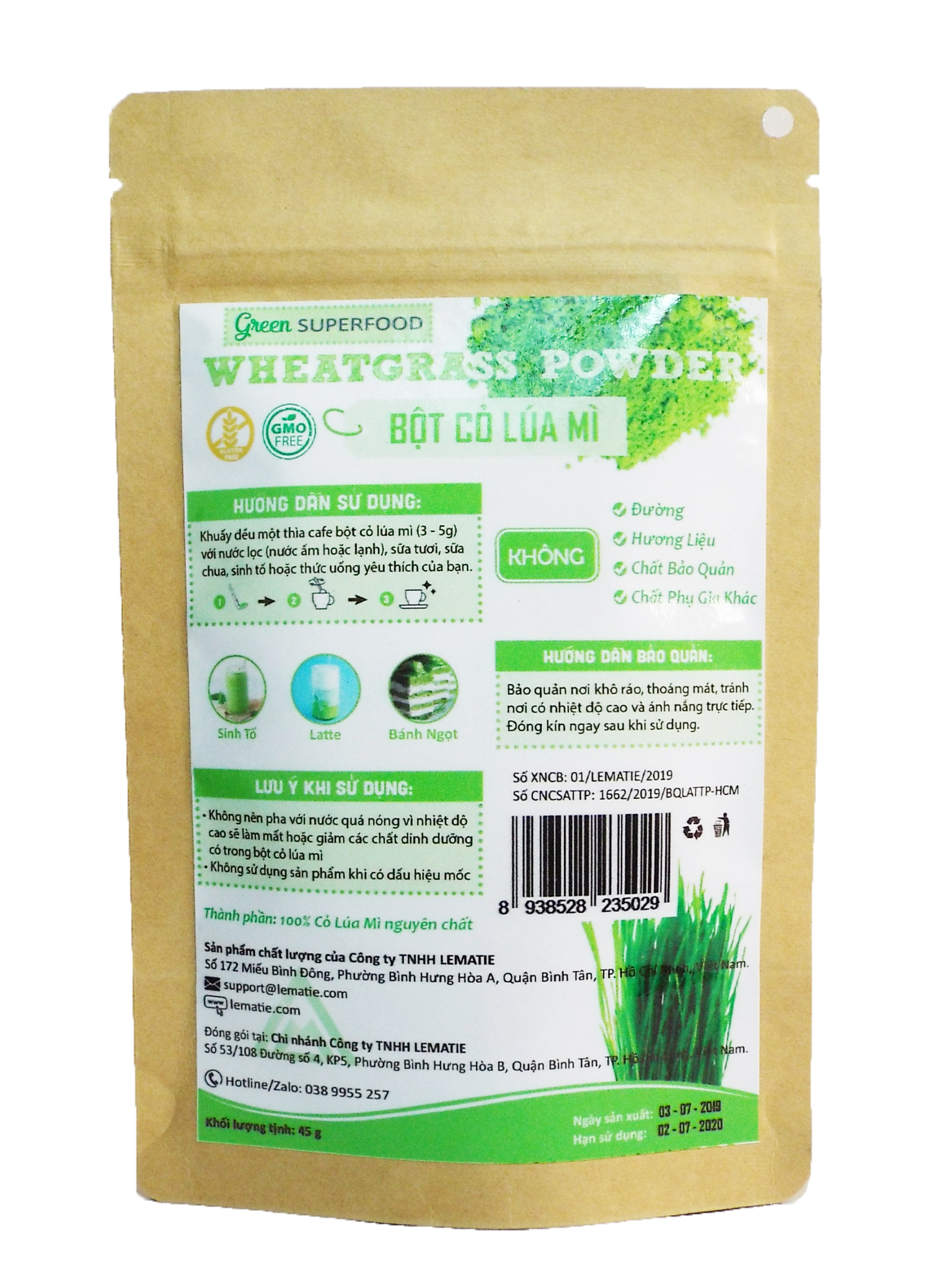 Bột Cỏ Lúa Mì – Lematie được sản xuất từ 100% Cỏ Lúa Mì nguyên chất, áp dụng công nghệ nghiền hiện đại trong dây chuyền sản xuất, những nhánh cỏ lúa mì tươi mơn mởn sẽ được nghiền cực mịn, giúp bột hòa tan với nước và các thực phẩm khác một cách dễ dàng và nhanh chóng. Ngoài ra, sản phẩm còn trải qua công đoạn sấy và tiệt trùng công nghệ cao, giúp bột vẫn giữ được màu xanh tươi mới mà vẫn đảm bảo giữ được chất diệp lục và những thành phần dinh dưỡng quan trọng khác.
