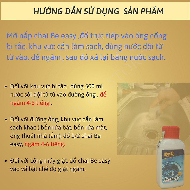 - Đối với đường ống, khu vực cần làm sạch khác ( bồn rửa bát, bồn rửa mặt, ống thoát nhà tắm), đổ 1/2 chai Be easy, ngâm 4-6 tiếng.