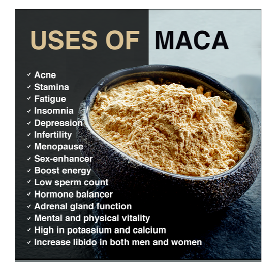 - Dùng bột Maca nâu hàng ngày trong 6 tuần giúp cải thiện huyết áp và một số khía cạnh của tâm trạng, bao gồm trầm cảm và lo lắng, ở phụ nữ sau mãn kinh.