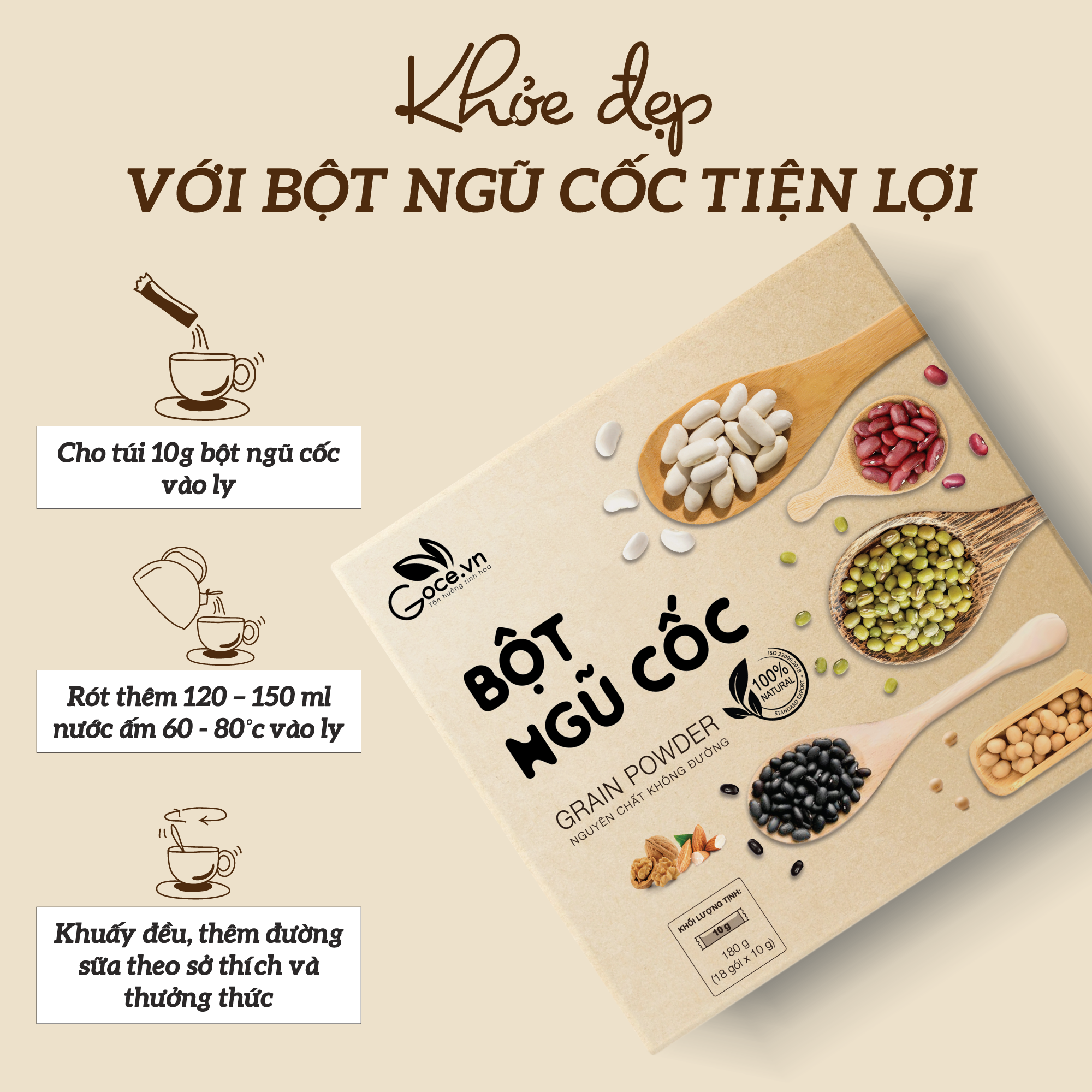 - Khối lượng: 180g (18 gói x 10g). - Thành phần: 100% nguyên chất từ ngũ cốc: Đậu xanh, Đậu nành, Đậu đen, Đậu trắng, Đậu đỏ, Óc chó, Hạnh nhân, Yến mạch, Mè đen, Đậu phộng.