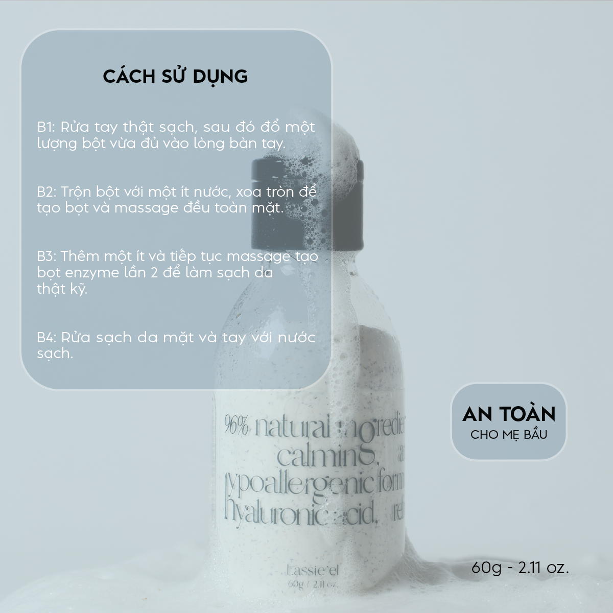 Dạng bột siêu mịn, hoà tan nhanh trong nước, bọt mềm mại làm sạch tạp chất trên da