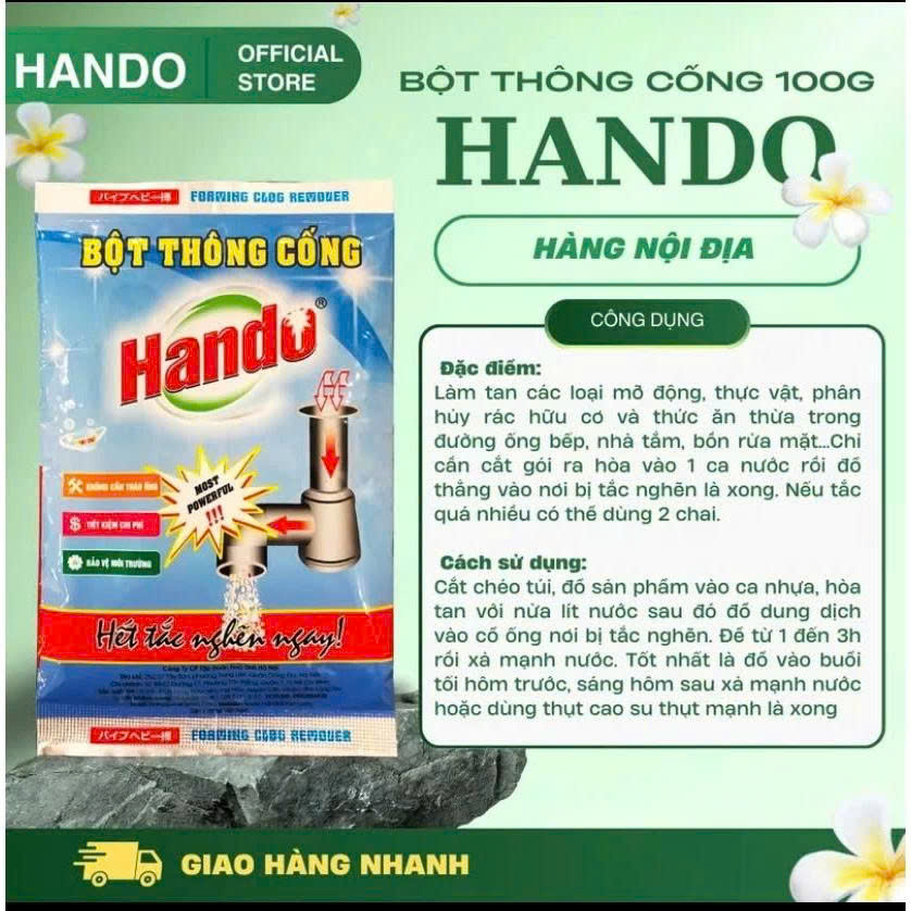 - Bột thông cống Hando 100g nội địa với công thức tiên tiến, các thành phần hóa học chuyên dụng, độ tẩy cực mạnh sẽ xoáy tan mọi cặn bẩn trong đường ống một cách hiệu quả.