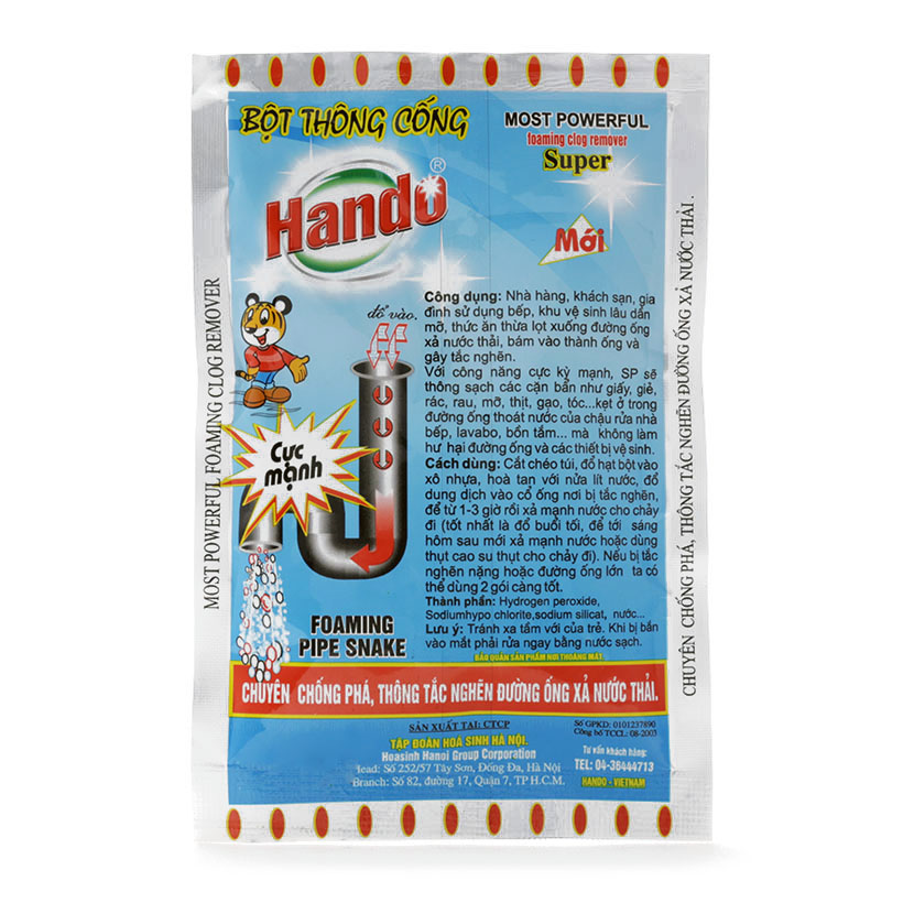 Thông tin sản phẩm Tên sản phẩm :Bột thông cống Hando 100g cực mạnh an toàn đường ống Thành phần : Nước, hydrogen peroxide, sodium silicat, sodiumhypo chlorite Thương hiệu : Hando Công dụng :