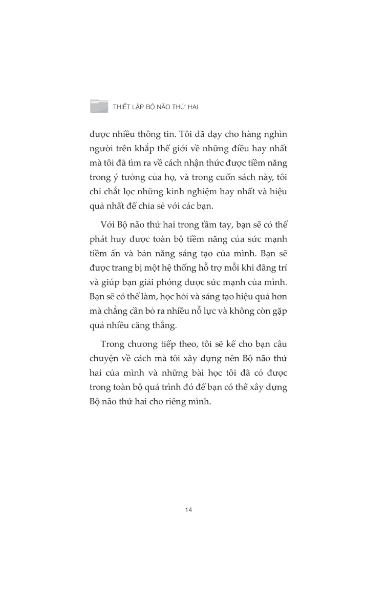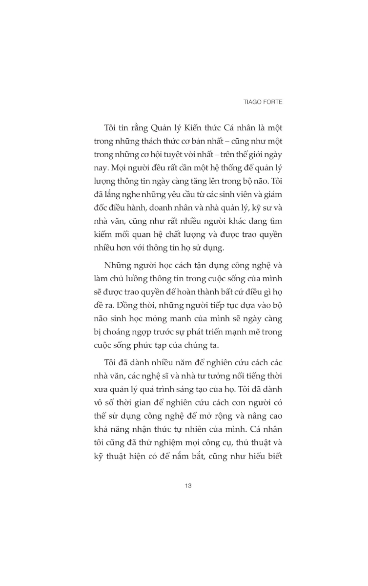 Buiding A Second Brain - Thiết Lập Bộ Não Thứ Hai GIỚI THIỆU SÁCH: Trong thời đại công nghệ thông tin phát triển mạnh mẽ, việc truy cập vào kho tàng kiến thức khổng lồ trở nên dễ dàng hơn bao giờ hết, nhưng cũng đặt ra thách thức về việc quản lý và sử dụng thông tin. Building A Second Brain - Thiết Lập Bộ Não Thứ Hai của Tiago Forte là một cuốn sách mang tính cách mạng, cung cấp hướng dẫn chi tiết về cách xây dựng hệ thống quản lý thông tin cá nhân hiệu quả. Cuốn sách giới thiệu khái niệm "bộ não thứ hai" - một kho lưu trữ kỹ thuật số có tổ chức và đáng tin cậy, giúp bạn lưu trữ, sắp xếp và sử dụng hiệu quả thông tin từ các ý tưởng, ghi chú sáng tạo đến kinh nghiệm quan trọng, đồng bộ hóa trên tất cả các thiết bị và nền tảng. Cuốn sách sẽ giúp bạn xây dựng một hệ thống lưu trữ thông tin cá nhân hiệu quả, tổ chức và lọc thông tin dễ dàng tìm kiếm và sử dụng, áp dụng hệ thống Second Brain vào cuộc sống hàng ngày để đưa ra quyết định và giải quyết vấn đề hiệu quả hơn. Bạn sẽ học cách tự động hóa và tối ưu hóa quy trình lưu trữ và xử lý thông tin, biến những gì bạn biết thành những cải tiến mạnh mẽ và có ý nghĩa trong công việc và cuộc sống. Về tác giả Tiago Forte, ông là một trong những chuyên gia hàng đầu về hiệu suất cá nhân, đã giảng dạy cho hàng nghìn người về các nguyên tắc thời gian và công nghệ tiên tiến nhất để cách mạng hóa năng suất, sự sáng tạo và hiệu quả cá nhân. Ông từng làm việc với nhiều tổ chức lớn như Genentech, Tập đoàn Toyota Motor và Ngân hàng Phát triển Inter-American. Tiago Forte cũng xuất hiện trên nhiều ấn phẩm uy tín như New York Times, The Atlantic và Harvard Business Review.