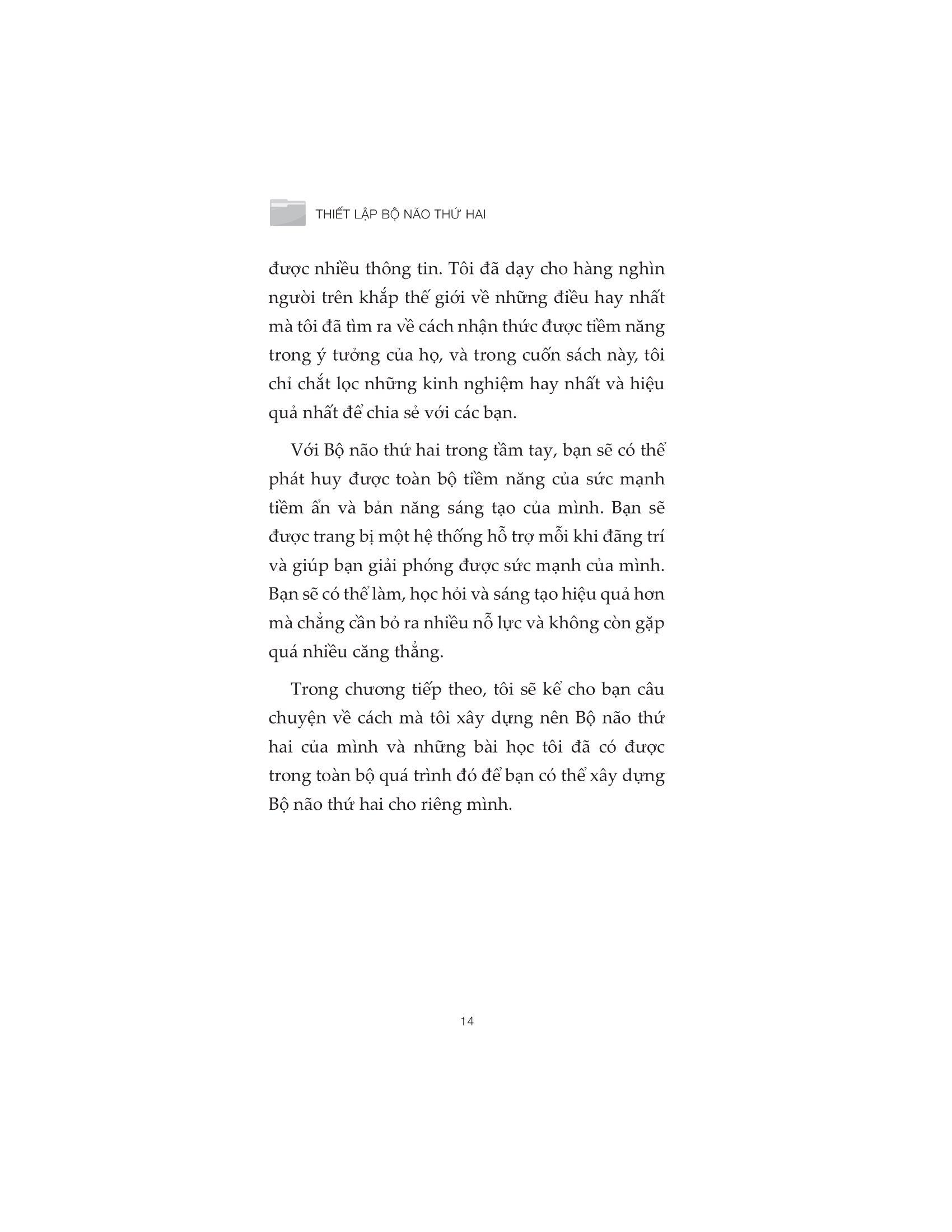 Cuốn sách Buiding a Second Brain - Thiết lập bộ não thứ hai làmột cách tiếp cận mang tính cách mạng, một bản hướng dẫn, chỉ ra các phương pháp để bạn có thể dễ dàng tạo hệ thống dữ liệu công việc cá nhân để quản lý kiến thức. Hệ thống này chính là kho lưu trữ kỹ thuật số có tổ chức và đáng tin cậy, chứa các ý tưởng, ghi chú sáng tạo có giá trị nhất, được đồng bộ hóa trên tất cả các thiết bị và nền tảng của bạn. Bộ não thứ hai mang đến cho bạn sự tự tin để giải quyết các dự án quan trọng nhất và các mục tiêu đầy tham vọng của m.ình.