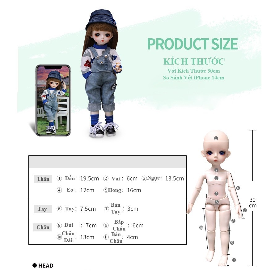 Chân tay của búp bê có thể cử động được. Cơ thể có thể đứng ngồi nhưng không thể nói chuyện. Trang phục có thể tháo ra được. Mắt được làm bằng chất liệu Acylic 3D cao cấp không dễ chày xước. Các chi tiết bóng khớp được thiết kế hoàn toàn bằng tay thủ công. Nên rất là tỉ mĩ và sắc nét. Búp bê cao tới 30cm mô phỏng như người thật. Quần áo thời trang được may chắc chắn và thẩm mỹ không thua kém gì so với quần áo đời thật. Búp bê được đóng gói thật kỹ và chắc chắn giúp bảo vệ thật tốt trong quá trình vận chuyển.