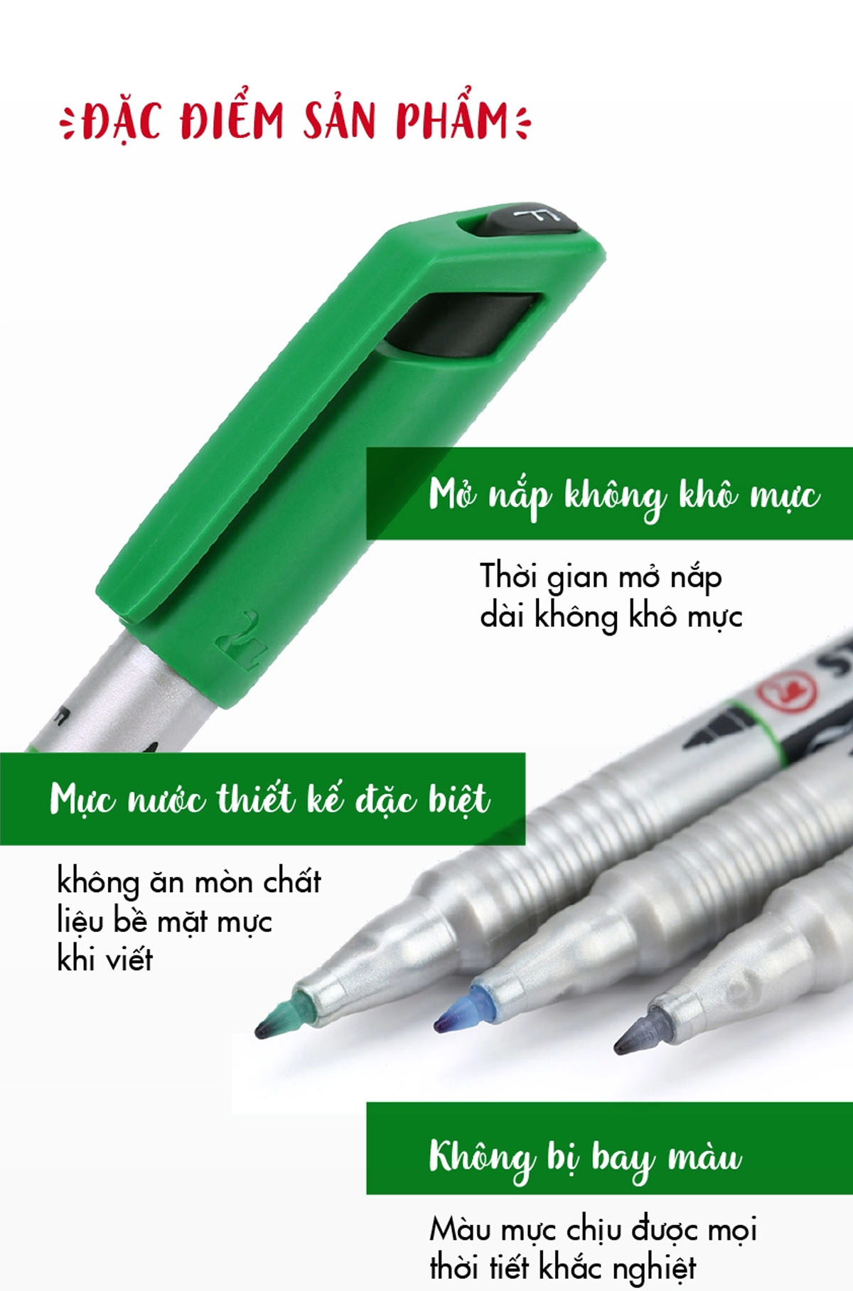 - Viết được trong mọi điều kiện môi trường khắc nghiệt: nóng, lạnh, mưa - Viết được trên mọi bề mặt trơn, tạo cảm giác thoải mái khi viết - Mực không chất độc hại,