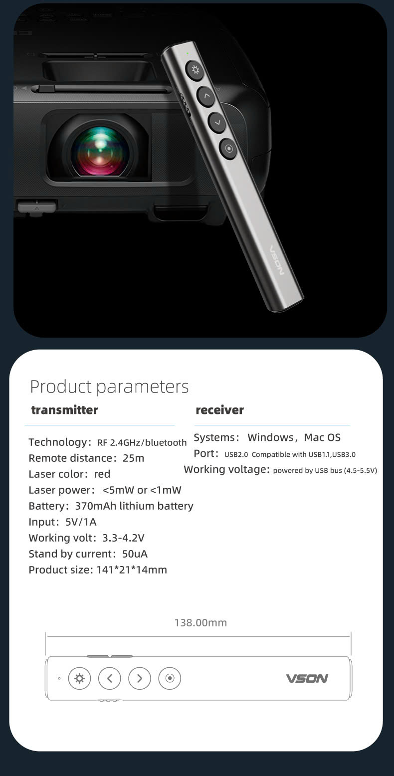 Bút Trình Chiếu Kỹ Thuật Số VSON N39M – Tích Hợp Laser, Bluetooth & USB, tia kỹ thuật số có thể sử dụng được màn chiếu, tivi, bảng tương tác Mô tả sản phẩm: -