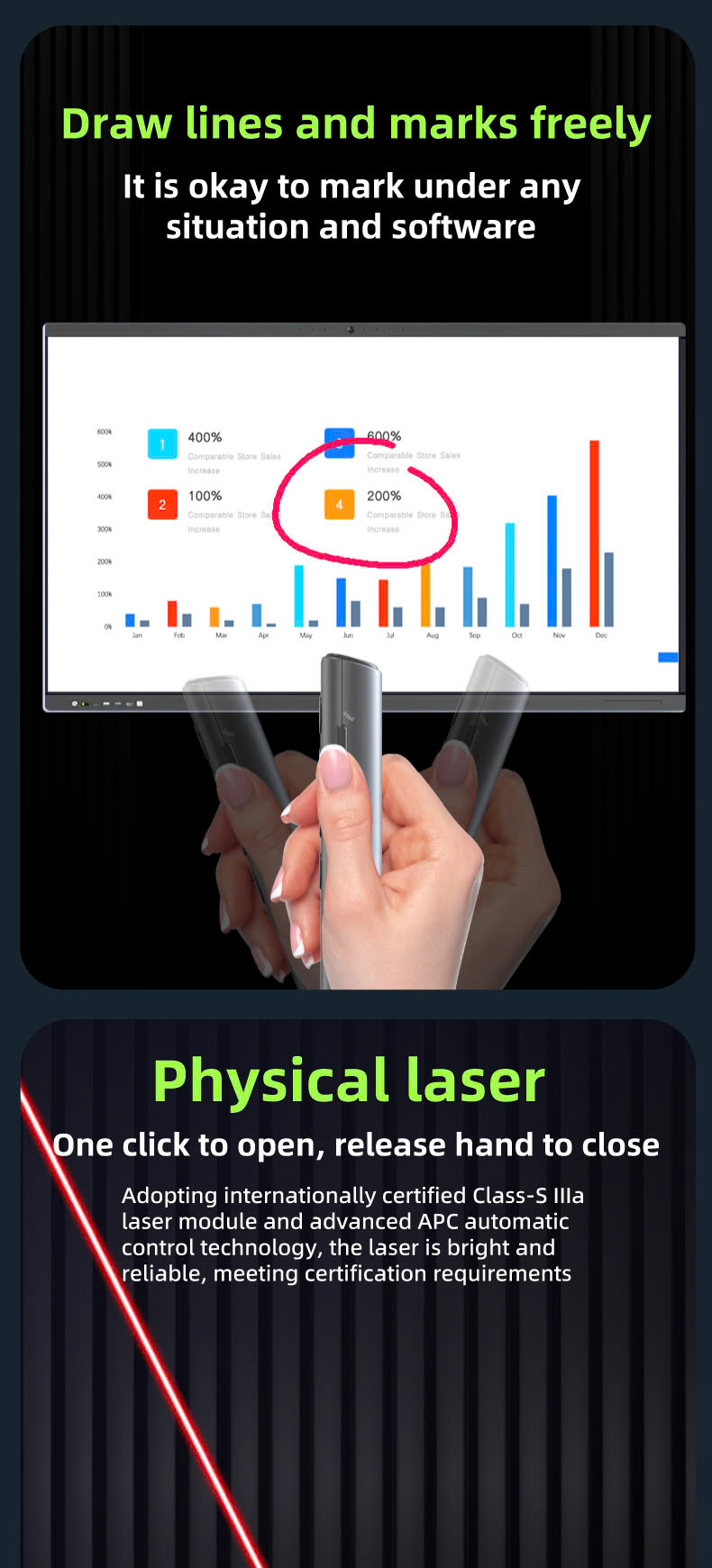 Laser xanh: Người dẫn chương trình không dây với tia laser màu xanh lá cây hiển thị tốt hơn trên nhiều nền khác nhau, ánh sáng xanh lục tươi sáng giúp bạn chỉ rõ mọi thứ